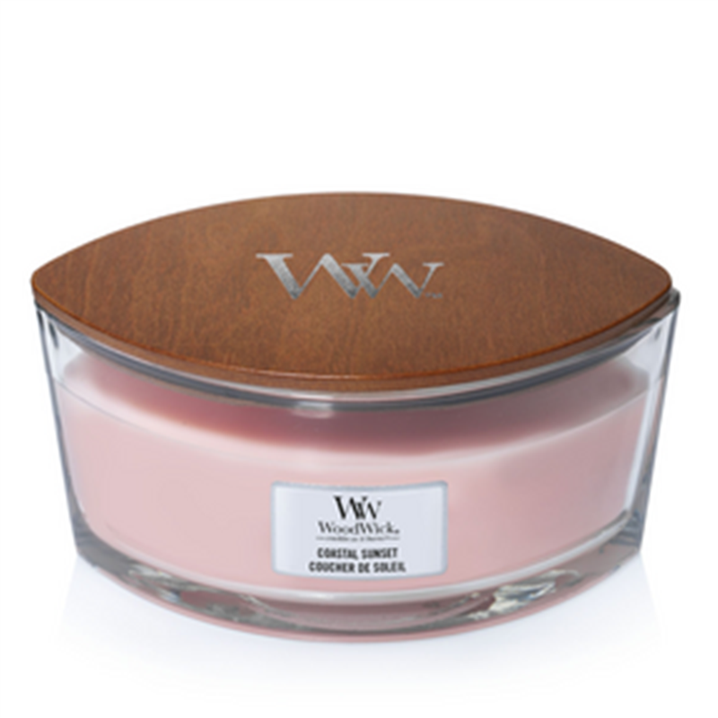 Glass: Elliptical shape creates a wider opening for a fully melted pool of wax producing a more consistent fragrance experience. Includes wood style lid.