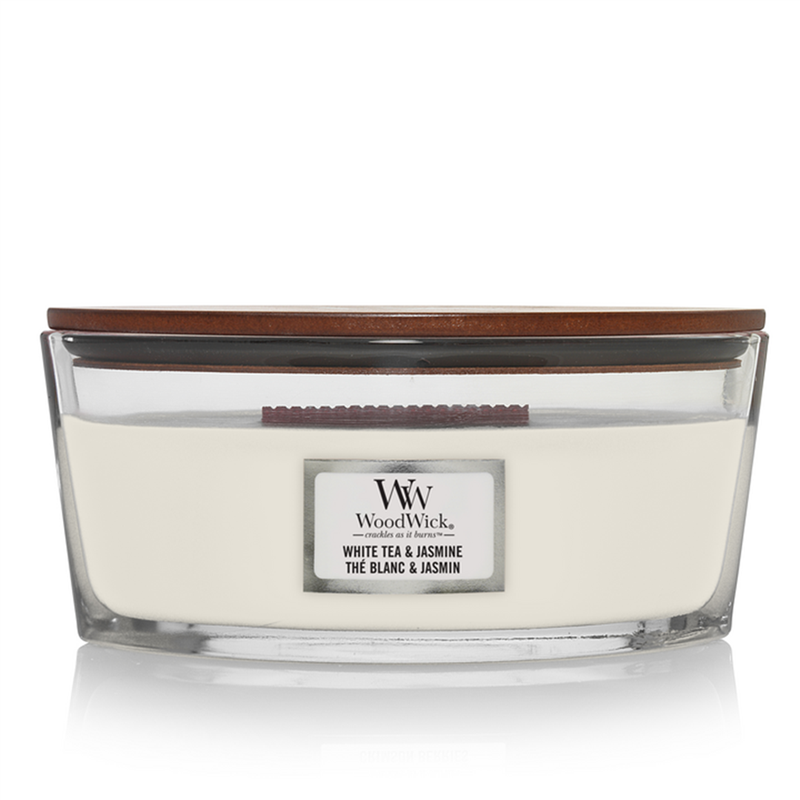 the white tea &- jasmine ellipse candle with crackling wick by woodwick is inspired by white tea.