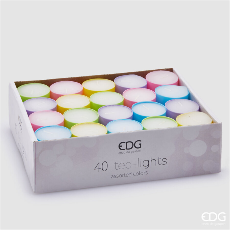 the tealight base color d3.8cm h2.3cm 40p multicolor candle by edg - enzo de gasperi is a set of multicolored tealight candles. each candle has a diameter of 3.8 cm and a height of 2.3 cm. the package contains 40 pieces, ideal for creating a warm and colorful atmosphere in any environment.