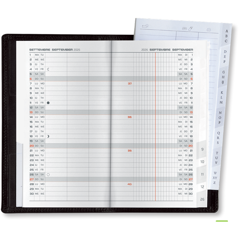 176 MEMORELLO, 8.7X15.3, DIE-CUT MONTHLY PLANNING, 4 LANGUAGES: I-GB-FD, WHITE PAPER 80 GR. FSC®, 1ST ISSUE 32 PAGES DIARY PART, WITH MONTHLY DIE-CUT, TWO-COLOR DIARY PRINTING, 2nd ISSUE 16 PAGES DIE-CUT PHONE BOOK PART, ONE COLOR ADDRESS BOOK PRINTING
