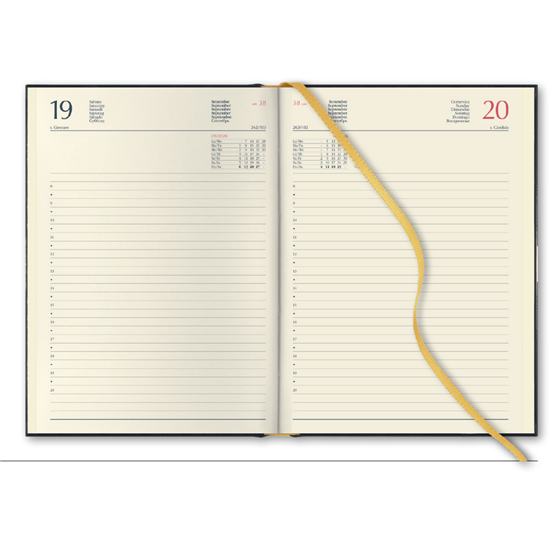 227 NOVECENTO, 14.5X20.5, DAILY, 6 LANGUAGES: I-GB-FDE-RUS, 70 GR IVORY PAPER. FSC®, 384 PAGES INCLUDING ADDRESS BOOK, 4 PAGES OF 4 COLOR MAPS, TWO COLOR PRINTING, GOLD BOOKMARK
