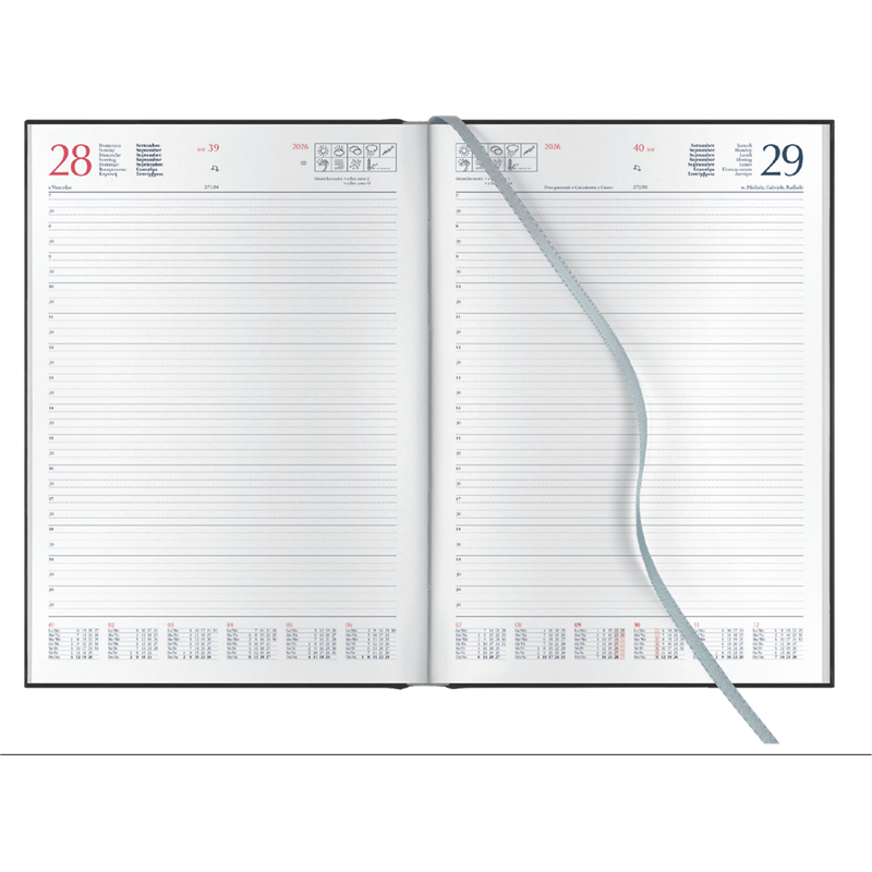 651, 21X29.7 CM, DAILY DESKTOP DIARY, 384 PAGES INCLUDING PRINTED ADDRESS BOOK, 7 LANGUAGES: I-GB-FDE-RUS-GR, 70 GR FSC® WHITE PAPER, TWO-COLOR PRINTING, GRAY CAPITAL, GRAY BOOKMARK, STITCHING REFE THREAD, HATCHED PERFECTION PARALLEL TO THE BACK
