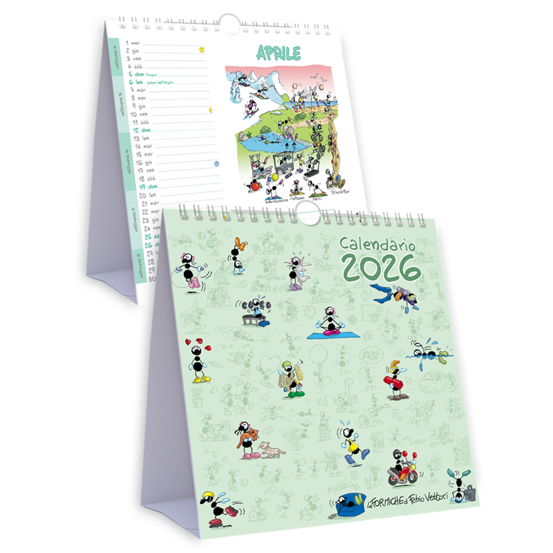 16x17 cm desk calendar for 2026, featuring illustrations of cute ants by Fabio Vettori. Each month features a detailed and humorous scene that captures the ants'- daily adventures, adding a touch of creativity and fun to your desk. Perfect for organizing with style and originality.