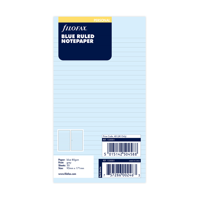 Filofax Personal size refill with blue lines. Perfect for organizing appointments and notes while maintaining a classic and professional style.