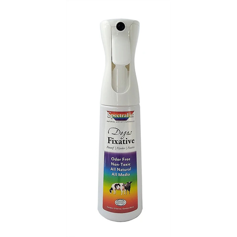 Non-toxic and odorless spray. Quick-drying with a matte finish. Suitable for a wide range of media. Repaintable. Made with casein, alcohol, and water. Invisible, matte finish, quick-drying. Can be used on pastels (soft, pan, and oil), colored pencil, graphite, charcoal, chalk, as well as in combination with watercolor, gouache, casein, ink, or for layering other media in encaustic and much more. Compatible with surfaces such as: all papers, suede or grained paper, primed and unprimed canvas, wood panels, unglazed ceramic, stone, leather, glass, etc.