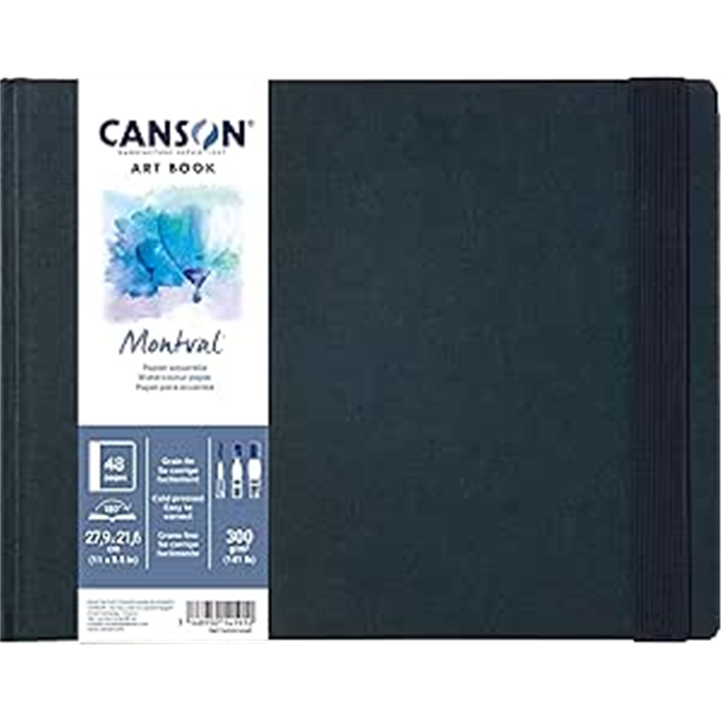 Artbook 14x21.6 "-Montval"- 300 gsm, 28 sheets, glued short side, by Canson, is an elegant bound notebook with a fabric cover and elastic band. Canson Montval paper: 300g pure cellulose watercolor paper. Easy to use, it allows for easy corrections.