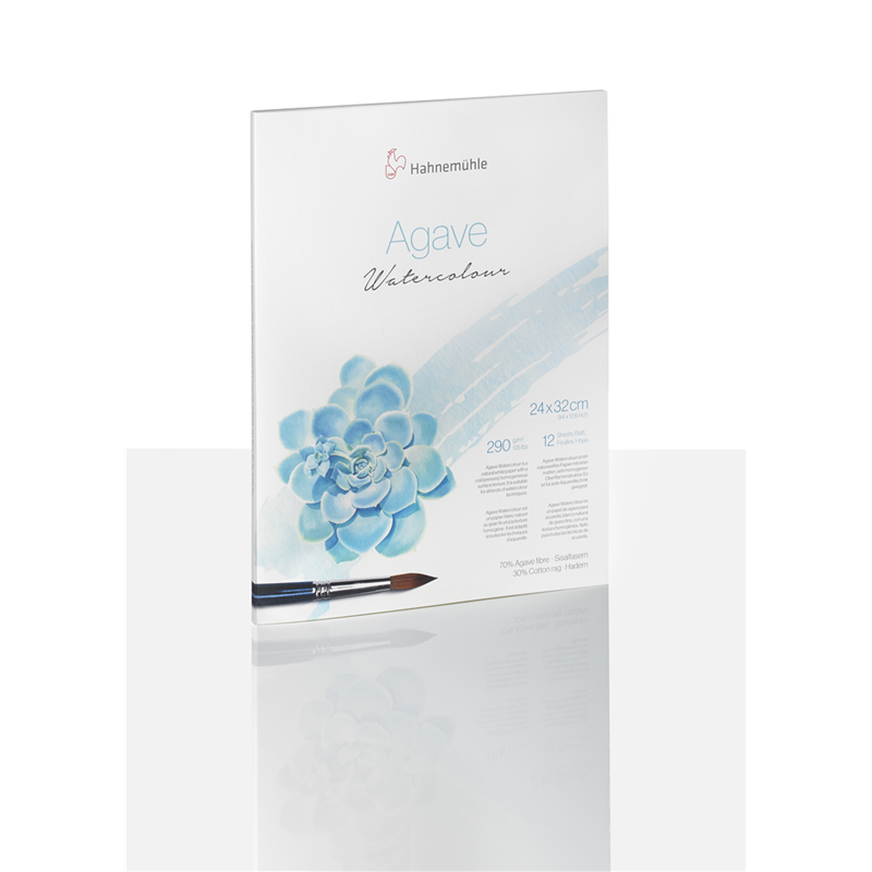 Agave Watercolor is a natural white watercolor paper. It is characterized by its cold-pressed and very homogeneous surface structure. It is suitable for all types of watercolor techniques, especially glazing. the special surface of the 290 g/m� paper allows the brushes to glide easily over the surface and enables brilliant color gradients. fades and corrections are simple possibilities. Agave Watercolor is acid-free, non-aging and vegan. Using sisal, a fast-growing and resource-saving raw material, Agave Watercolor is the ideal painting surface for environmentally conscious artists. all watercolor agave blocks are glued on 4 sides. the individual sheets can be easily removed with the hahnem�hle bamboo folder.