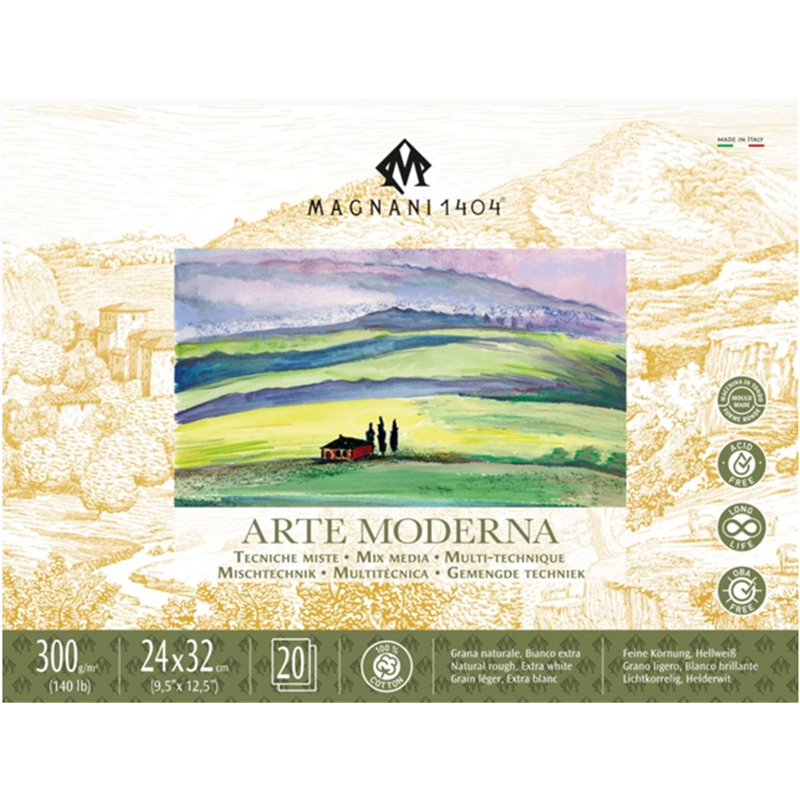 modern art paper is manufactured on a round machine, according to the ancient traditional procedure. its composition with 100% fine cotton fibers and its natural surface make it very versatile and ideal for all artistic techniques, both dry and wet, even combined together on the same sheet (media mix). the processing without acids and chlorine derivatives give the paper resistance to yellowing from UV rays and guarantee durability over time. its brilliant white color also guarantees maximum yield of the colors applied, enhancing their contrasts.