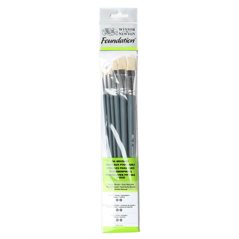 SET OF 6 NATURAL BRISTLE OIL BRUSHES, LONG HANDLE (ROUND NO. 3 AND 6, FILBERT NO. 3 AND 6, FLAT NO. 10 AND 14)