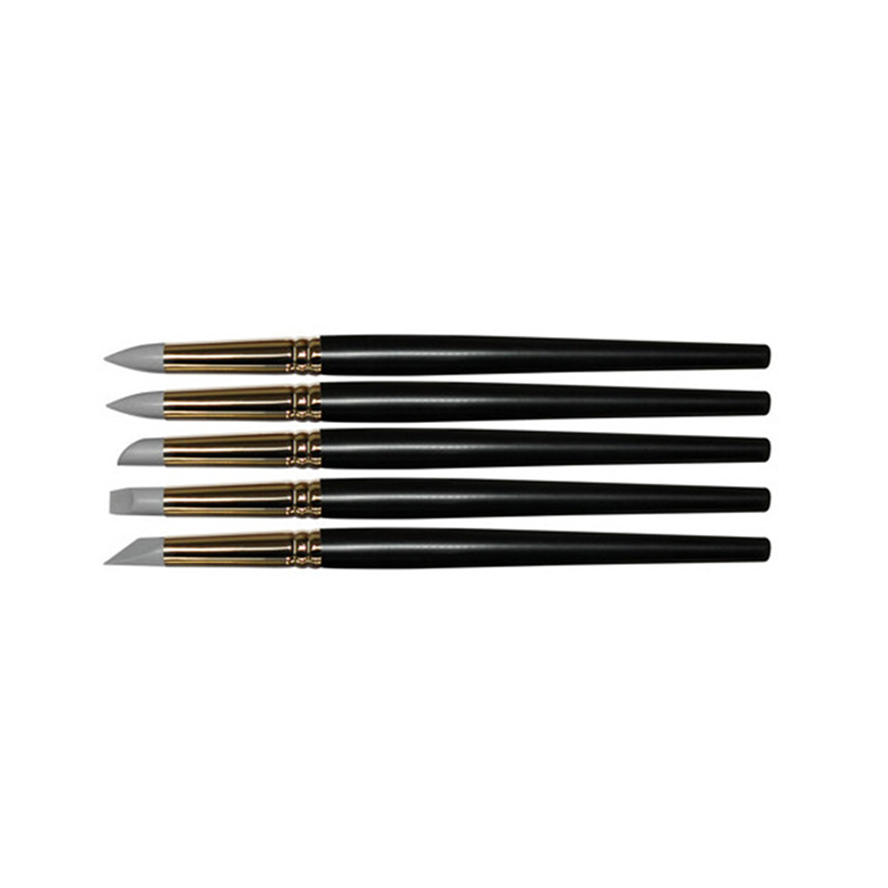 Brushes with soft gray silicone/rubber tip in five available shapes: conical, whistle, claw, wedge, knife. used for painting, applying masking liquids, mixing heavy duty paint graffiti, batik wax. also in sculpture.
