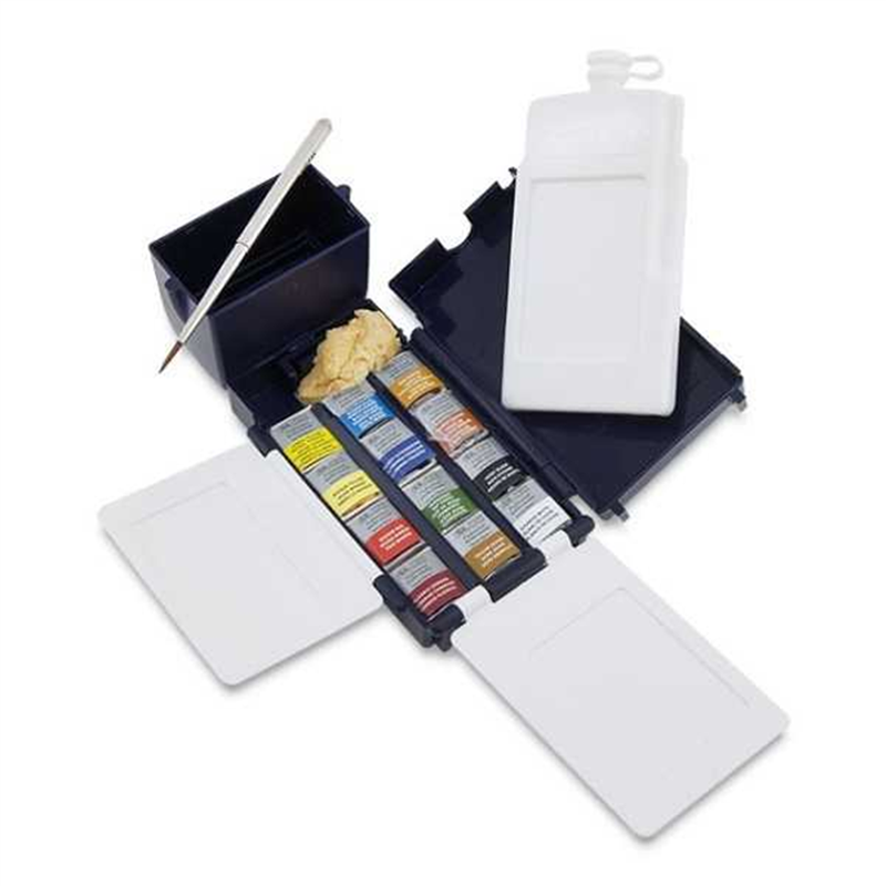 This sturdy, compact, and lightweight plastic set is ideal for painting on the go. A complete set for artists on the go, combining quality and practicality. The ingenious design of the box allows the cap, once removed, to snap on and transform into a handy water container, optimizing workspace, even in the tightest spaces.