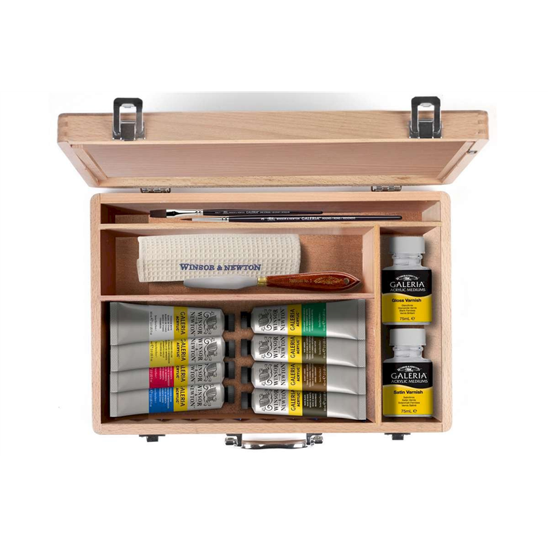 Discover the ultimate acrylic painting experience and see the world through the eyes of an artist. • Our complete set includes a sturdy wooden box filled with high-quality Galeria acrylic paints, essential additives, premium brushes and all the accessories you need to master the art of acrylic painting. Whether for yourself or an artist, this set is the perfect gift to inspire creativity and artistic expression. Contents • 8 x 60ml tubes of Galeria acrylics (Titanium White, Primary Red, Primary Yellow, Primary Blue, Permanent Medium Green, Raw Umber, Burnt Umber, Mars Black) • 2 x 75ml bottles of varnish (Satin and Gloss) • 1 x No. 1 painting knife • 2 x Galeria brushes: 6mm short flat and No. 3 round • 1 x No. 8 double pan • 1 x Winsor &- Newton embroidered cloth