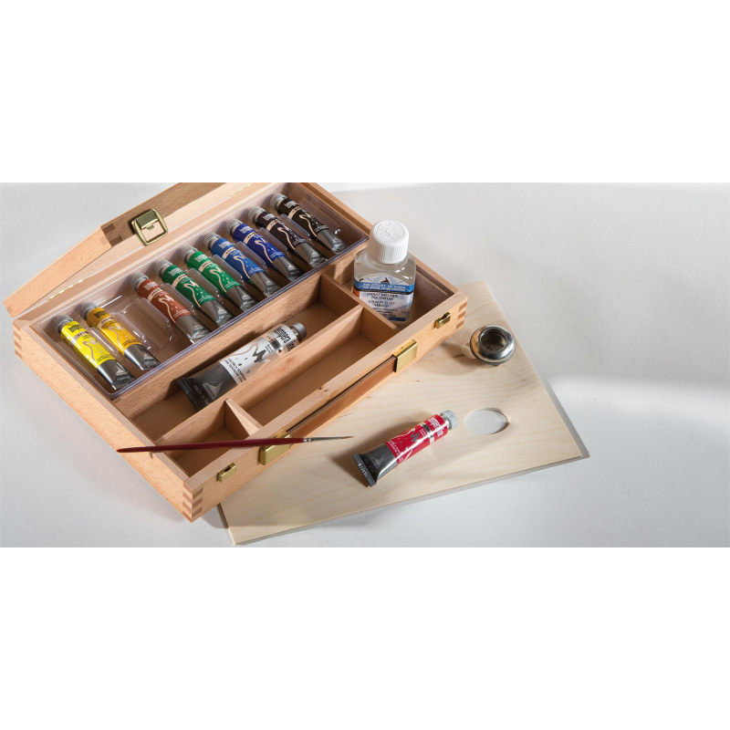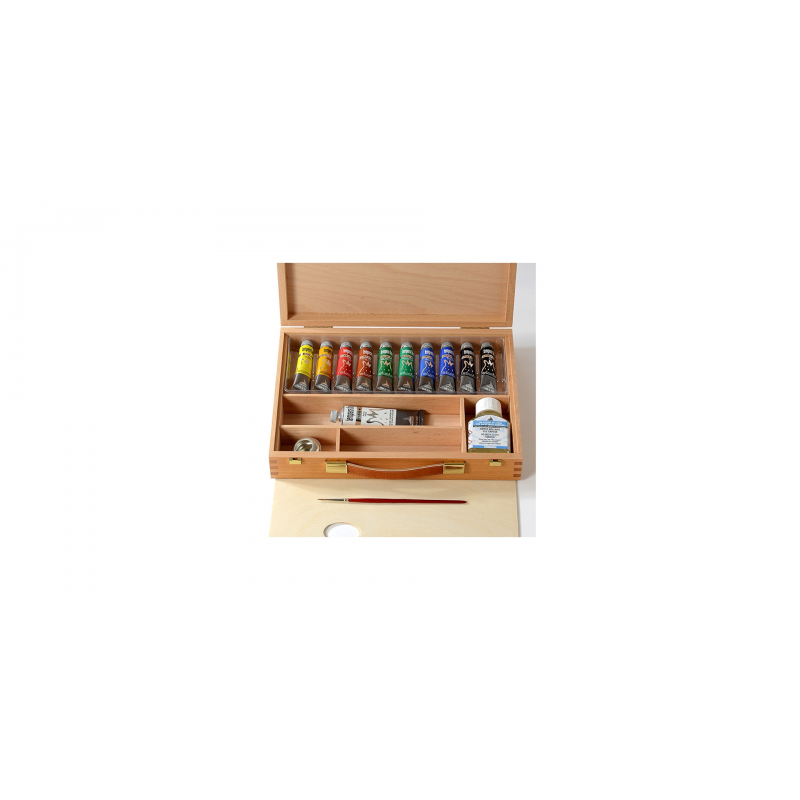 semi-gloss finish beech box, eko leather handle, palette and wooden dividers 20x30 cm. 10 assorted tubes 20ml, white 60ml, medium rinse aid 75ml, accessories.