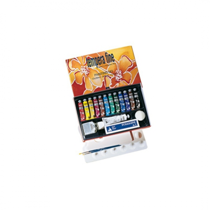 painting set, cardboard box, plastic palette, 12 assorted tubes 20ml, white 60ml, bright paint for tempera 75ml, charcoal case, 2 synthetic brushes, sponge.