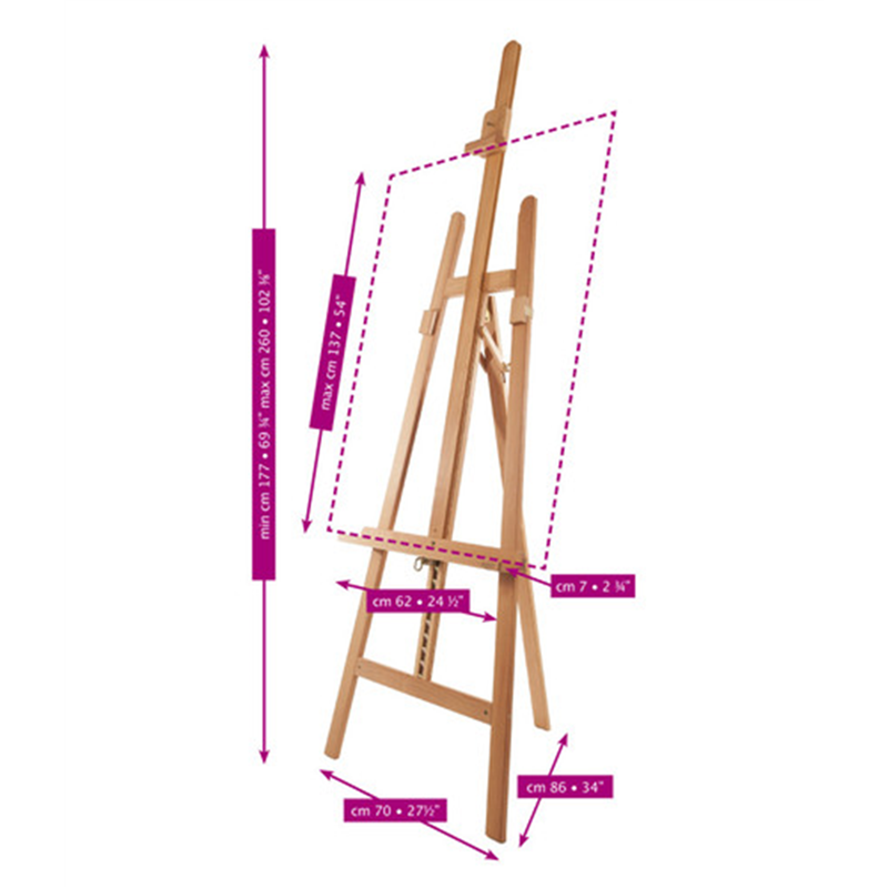 built in oiled evaporated solid beech. equipped with sliding supports to rest it. internal anti-vibration spring. rack-controlled elevation movement. supplied with mounting kit. measurements: cm. 55x65x165 / 230 weight 5.5kg. max canvas size cm. 125 max weight 10kg.