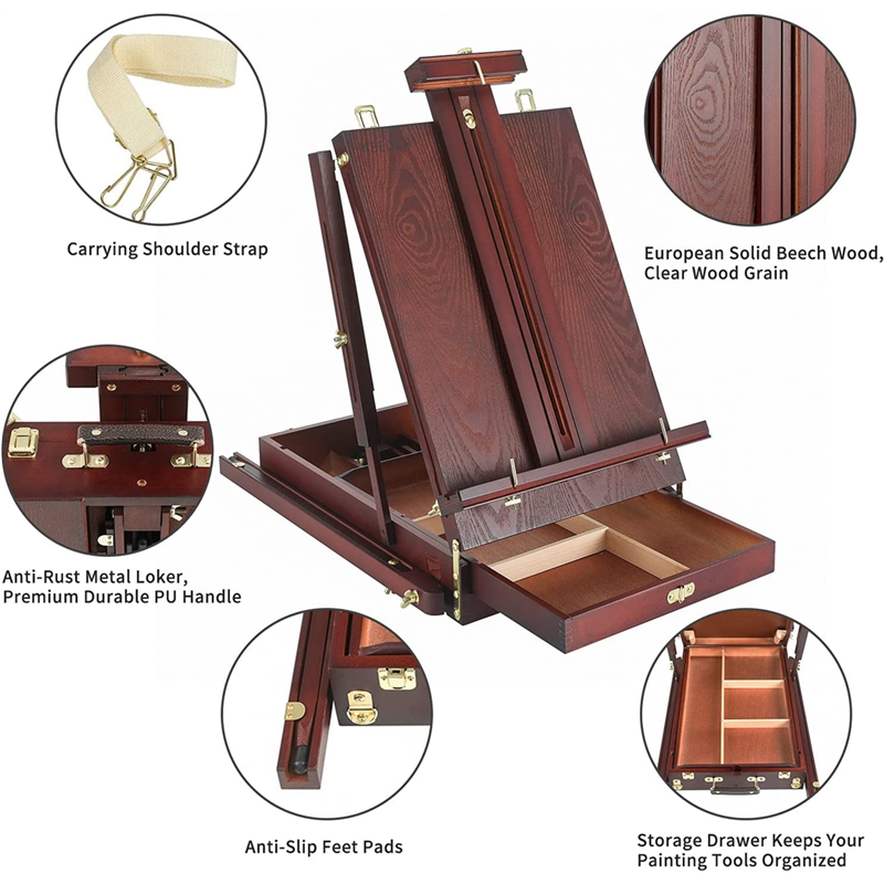 Solid Beech Wood? The sketch box easel is stained in walnut color for an elegant appearance. The high-quality European solid beech wood has been finely polished, passed the FSC certificate and conform to the European Union EN71 standard. All makes it a classic and durable French style easel. ?All in one multifunctional? The artist easel box can be used as a tripod easel by setting three legs or placing it in a tabletop orientation. Inside the painting box there is a personalized storage area: double drawers, which can organize your painting tools. ?Stability? The tripod and slider structure design is extremely sturdy. The anti-rust metal fasteners and nut can fix the adjustable parts in height and tight angles. The non-slip rubber feet are used on the floor or outdoors, which increase the bottom friction, do not slip and reduce vibration when painting. The top slider and support tray add extra metal rod to secure the drawing board when painting. ?Portability? The french easel can also be carried easily and conveniently by a nylon shoulder strap or pu handle. It is portable and not too heavy (14.5 lbs.) for outdoor painting. Only 17.1"- wide and 22.1"- long, it will not take up much space but meet all your needs when painting.