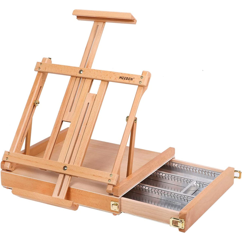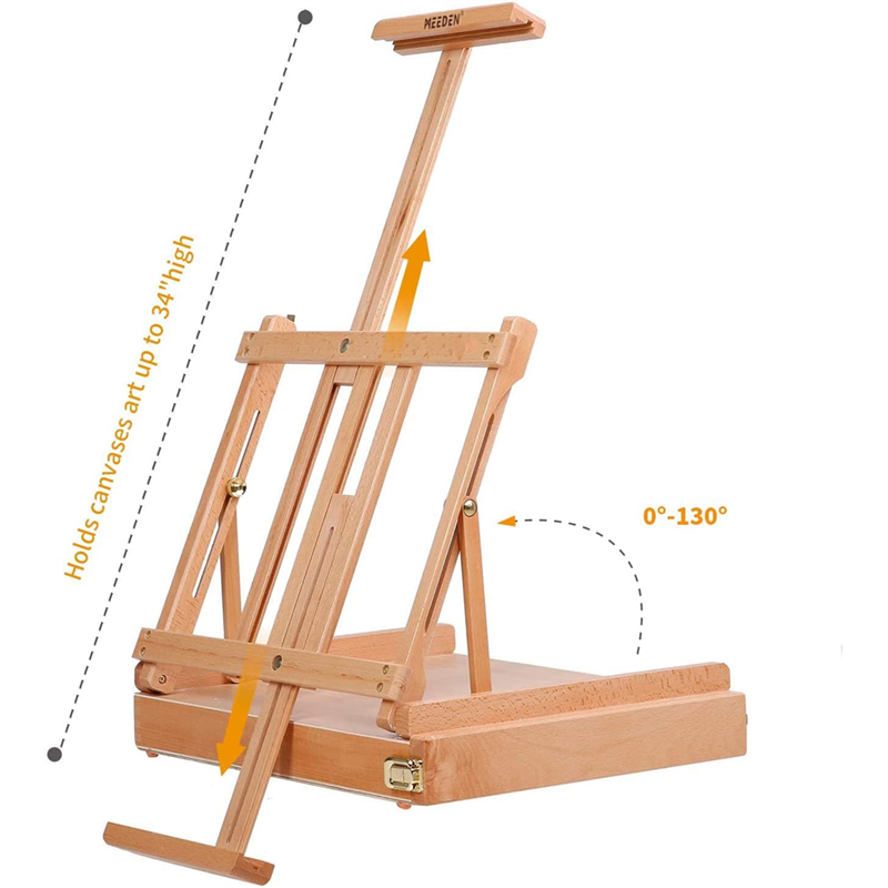 Beech Wood Desktop Easel Box - Handcrafted from high quality sanded solid European beech wood with brass plated hardware and leather carry handle, Dollies independently adjust for larger canvases, up to 34"- tall . Tabletop Easel with 2 Trays: 2 thickened sliders with stable canvas for slots and fit better on thin canvases and thicker stretched canvases, versatile equipment, meeden'-s sketchbox studio tabletop easel holds all your painting and drawing tools on the go , perfect for studio or plein air artist, art students and beginners smart and friendly design: built-in drawer is lined with aluminum and features adjustable dividers, organize supplies the way you like it. when folded, the easel can function as a wet canvas stand, allowing you to safely transport your field artwork just right size for travel - fully folded, the easel measures 41.90cm. l × 36.8cm. w × 11.5cm. a (adjusts up to 85cm. tall) and weighs 3.5 kg. no assembly is required. this stylish tabletop easel converts into a travel case for painting on the go