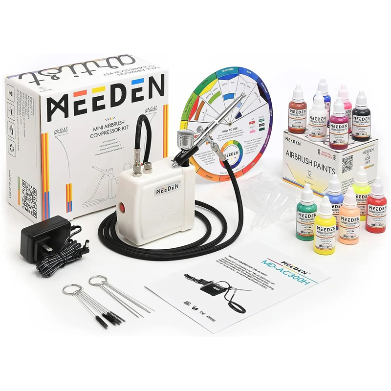 ESSENTIAL AIRBRUSH KITS: The kit includes AR35, a dual-action, internally blended, high-quality precision airbrush for a comfortable feel in the hand. The kit also comes with a quiet, efficient compressor, automatic start and stop, and delivers 21 psi. Easy to use airbrush cleaning brushes for cleaning after spraying. ar35 dual action airbrush: 0.5mm needle/0.7cc gravity cup. Featuring airbrushes with dual action functionality, easy to use, a single pull of the trigger releases both air and paint and is less prone to clogging. The dual action, internal mixing design controls both air and fluid, ideal for precise, crisp detail. compact white compressor: combined with the ar35 model there is the portable but powerful bm-0004 compressor, made with high quality precision components, silent and efficient and maintenance-free. Weighing just 8 pounds, with a maximum air pressure of 21 psi (0.37 cfm), it is the perfect complement to the AR35 model airbrush. Multifunctional Airbrush Set: It is an ideal airbrush kit for beginners and students, as well as advanced artists. as it works excellently for most airbrushing applications and also with most types of spray painting media. It'-s great for hobbies, crafts, automotive graphics, temporary tattoos, cake decorating, fine art, nail art and more!