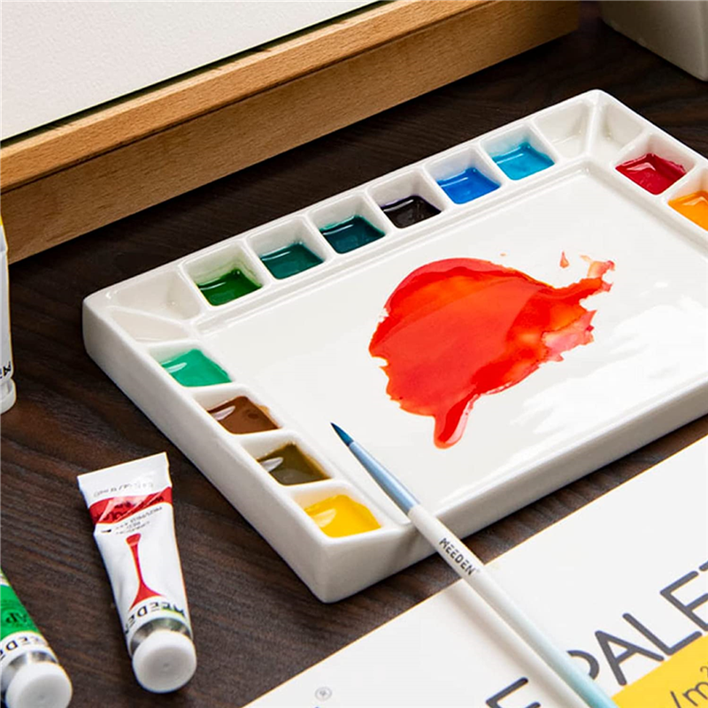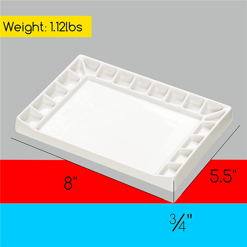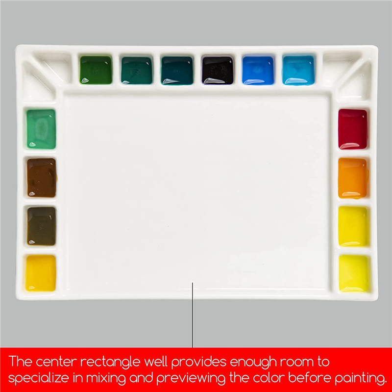 Made of high quality white eco-friendly ceramic material, so it is very durable. Great for watercolor, gouache, acrylic, oil, tempera painting. Good quality is excellent for mixing watercolor, heavy enough not to tip over, perfect for studio or field work White smooth surface, no drips, paint does not drip but spreads evenly and cleans up perfectly with a tissue, makes cleaning, mixing and makes colors come alive 18 deep paint wells and a large mixing area. The center is perfect for mixing colors and it is super easy to clean the center and maintain the paint who love this palette. Well designed with plenty of room to mix colors, helps you improve their skill in mixing colors. I highly recommend this palette to anyone looking for a nice and sturdy studio or field palette