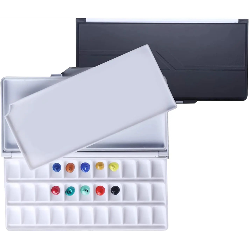 KEEPS PAINT FRESH: This paint tray palette has an airtight silicone seal on the lid, great for keeping paint trays moist and easy to clean. keep your colors neat and organized. large capacity: 33 inclined deep wells. each good size: 1.37"- long x 1"- wide. the foldable palette has a large tray for color mixing, it is flat and perfect for mixing once the color palette is fully opened. Strong and Sturdy Black Watercolor Palette: It is made of injection mold plastic, sturdy and substantial in hand. the thick plastic palette doesn'-t bend so easily. palette folding dimensions: 12.6 x 6.3 x 1.0 inches. Travel and Drawing Set: The compact and lightweight watercolor set can be easily stored in your bag. furthermore, the snap closure system avoids the risk of components falling or coming loose during travel. ideal for all water-based media: the palette works perfectly with watercolors, acrylics and other water-based pigments. Suitable for artists of all painting occasions.