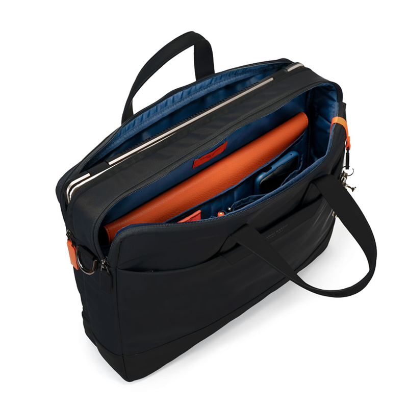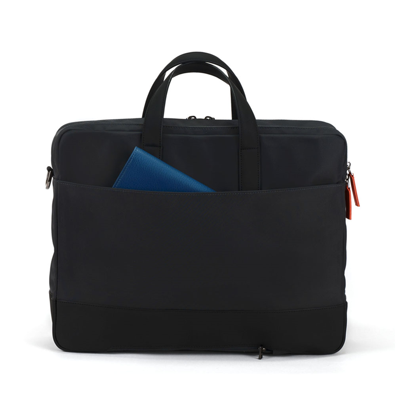 comfortable water-repellent and super-equipped bag. it can accommodate a laptop up to 15.6'-'- and other digital devices thanks to the organized interior. equipped with a front pocket to always have keys and badges at hand, it also has a back pocket to keep all your personal effects safe. practical and compact, it is perfect for holding documents, a water bottle, a wallet, a smartphone and all your belongings. choose whether to carry it by hand or cross-body thanks to the removable shoulder strap. ideal for going to work or to take on the road thanks to the practical trolley attachment system. features zip closure 2 compartments exterior: front pocket and back pocket interior: organized with 2 compartments, one with flat pocket and laptop holder (up to 40l x 29h) and the other with 4 flat pockets, 2 pen compartments and compartment for tablet/ipad, pocket with zip and hook for keys trolley attachment system portability: by hand and over the shoulder adjustable and removable shoulder strap dimensions: 40w x 31h x 9d cm- weight: 900g