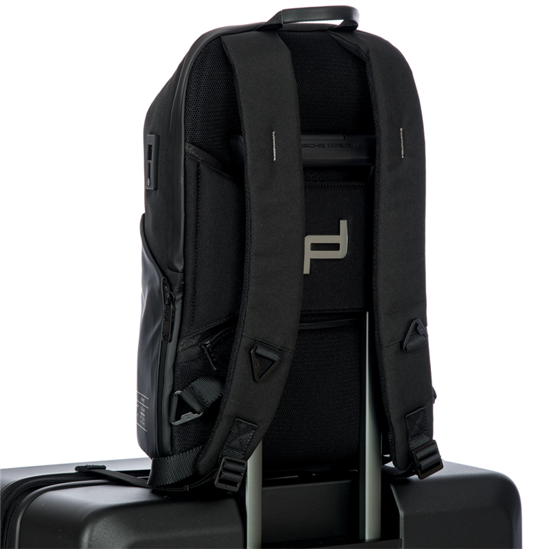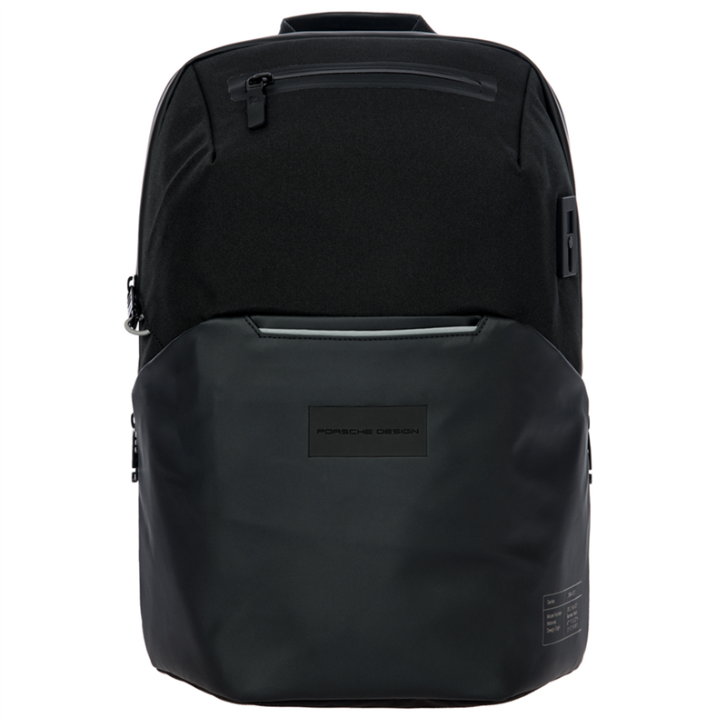 "-A combination of style and sustainability, functionality and flexibility, work and travel: the Porsche Design Urban Eco series is unconventional, yet perfect for modern everyday life. The compact Porsche Design Urban Eco XS backpack captivates at first glance thanks to the combination of waterproof polyester and coated fabric and the clean design with laminated zippers and black metal fittings. At second glance, it is the details that catch the eye: the rubberized logo patch, the reflective piping and the print inspired by the Porsche model badge with the coordinates of Zell am See, home of the F.A. Porsche studio. The invisible comfort of the carefully designed backpack is clearly noticeable to everyone who wears it. The padded straps, the padded neoprene back with trolley attachment, the main pocket with two-way zipper, USB connector and compartments for notebooks and tablets, the numerous functional pockets with organizers and the hidden rain cover in the base make this backpack the perfect 24-hour companion. Details: • backpack Compact men'-s backpack. • Modern material mix with polyurethane and recycled polyester. • Main compartment with two padded pockets for laptops up to 13"- and a tablet, additional zippered compartment. • Front pocket, two zippered side pockets, zippered back pocket. • Zip pocket on top with interchangeable zipper pull (color variant). • Hidden rain cover in the base.