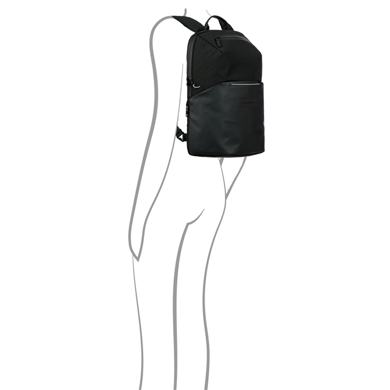 "-A combination of style and sustainability, functionality and flexibility, work and travel: the Porsche Design Urban Eco series is unconventional, yet perfect for modern everyday life. The compact Porsche Design Urban Eco XS backpack captivates at first glance thanks to the combination of waterproof polyester and coated fabric and the clean design with laminated zippers and black metal fittings. At second glance, it is the details that catch the eye: the rubberized logo patch, the reflective piping and the print inspired by the Porsche model badge with the coordinates of Zell am See, home of the F.A. Porsche studio. The invisible comfort of the carefully designed backpack is clearly noticeable to everyone who wears it. The padded straps, the padded neoprene back with trolley attachment, the main pocket with two-way zipper, USB connector and compartments for notebooks and tablets, the numerous functional pockets with organizers and the hidden rain cover in the base make this backpack the perfect 24-hour companion. Details: " backpack Compact men'-s backpack. " Modern material mix with polyurethane and recycled polyester. " Main compartment with two padded pockets for laptops up to 13"- and a tablet, additional zippered compartment. " Front pocket, two zippered side pockets, zippered back pocket. " Zip pocket on top with interchangeable zipper pull (color variant). " Hidden rain cover in the base.