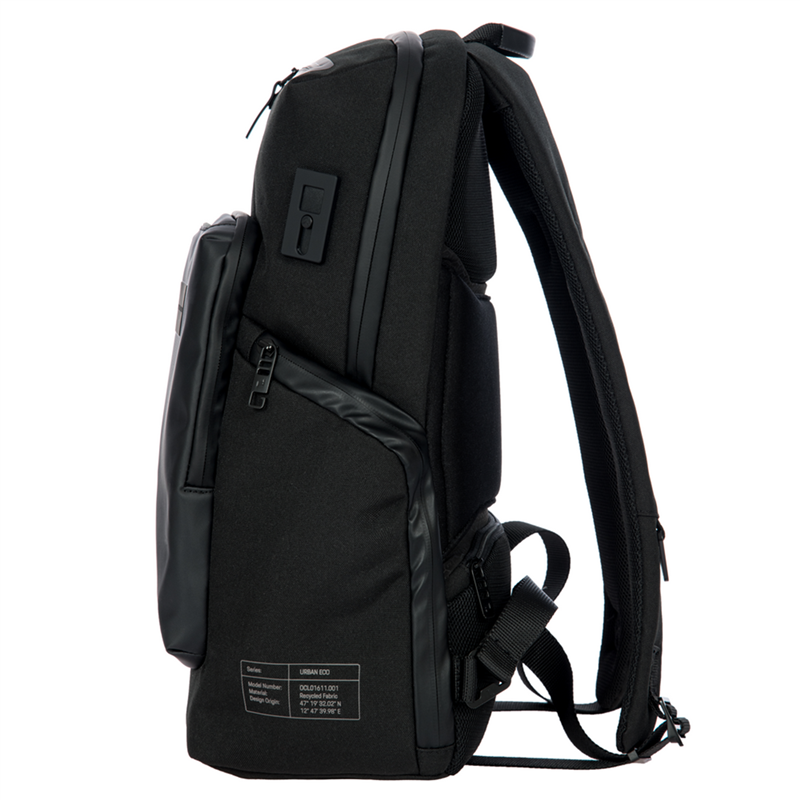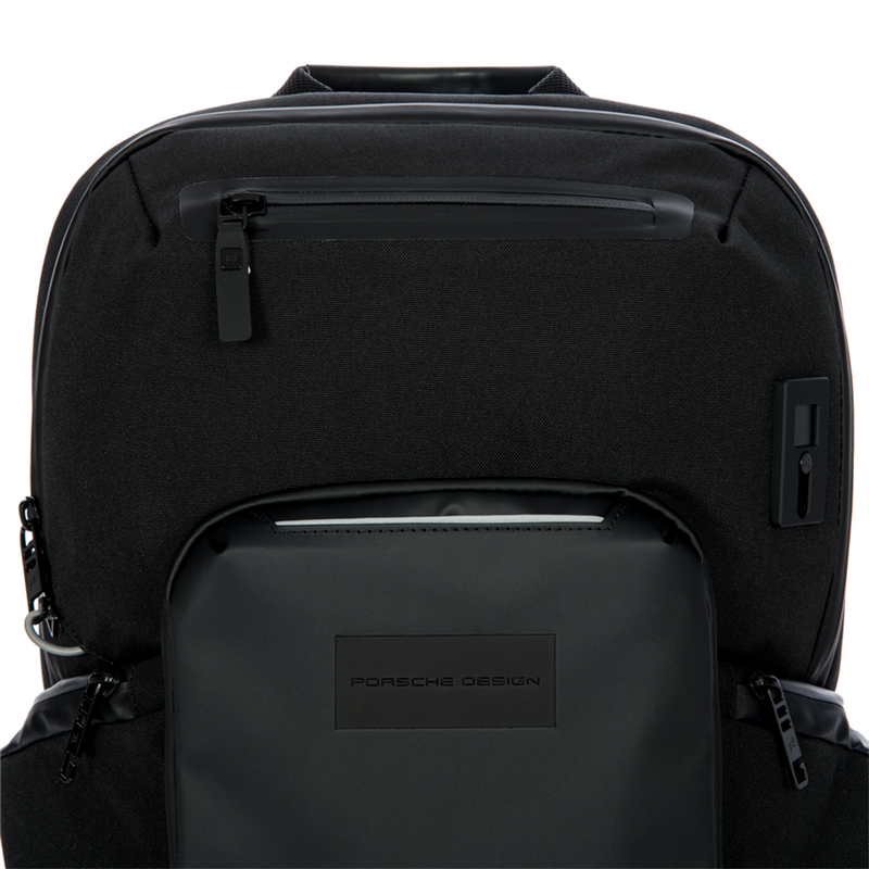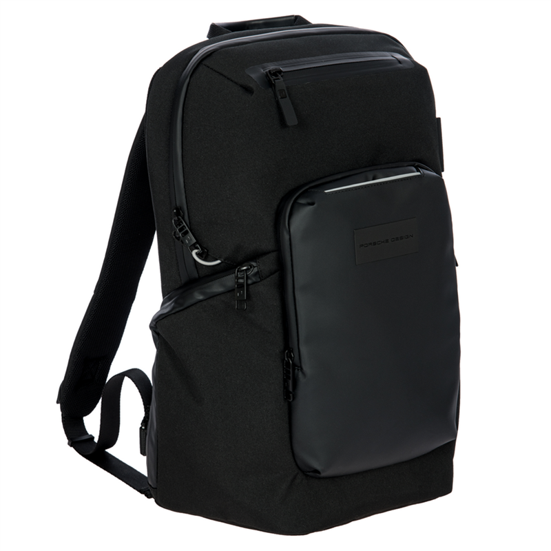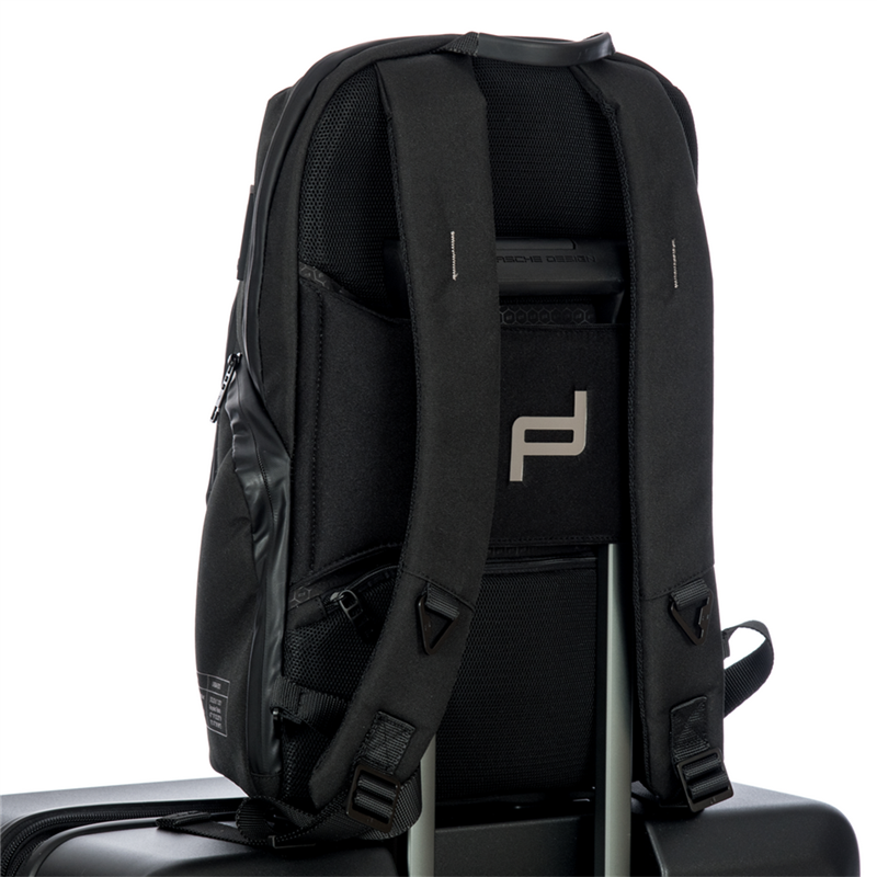 A combination of style and sustainability, functionality and flexibility, work and travel: the Porsche Design Urban Eco series is unconventional, yet perfect for modern everyday life. The elegant Porsche Design Urban Eco S backpack captivates at first glance with its clean, technical design: waterproof polyester with a coated fabric patch pocket, laminated zippers, and black metal hardware. At second glance, it'-s the details that catch the eye: the rubberized logo patch, the reflective piping, and the Porsche model badge-inspired print with the coordinates of Zell am See, home of the F.A. Porsche studio. The carefully designed backpack'-s invisible comfort is clearly noticeable to everyone who wears it. The padded straps, padded neoprene back panel with trolley attachment, main compartment with two-way zipper, USB port, and notebook and tablet compartments, numerous functional pockets with organizers, and a hidden rain cover in the base make this backpack the perfect 24-hour companion. Details: " Stylish and functional men'-s backpack made of polyurethane and recycled polyester. " Main pocket with padded compartment for laptops up to 13"-, tablet compartment and USB port. " Zippered patch pocket with work organizer, additional front pocket. " Two side zippered pockets, zippered pocket on the back. " Zippered pocket on the top with interchangeable zipper pull (color variant). " Hidden rain cover in the base.