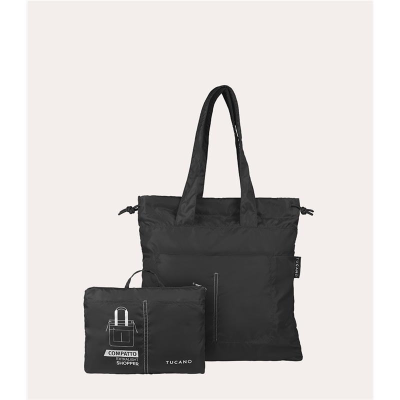 Lightweight and foldable shopper, made of nylon obtained from recycled plastic. easily transformable into a flat pocket, the compact shopper, with drawstring closure, is equipped with a comfortable external pocket and ribbon shoulder straps.