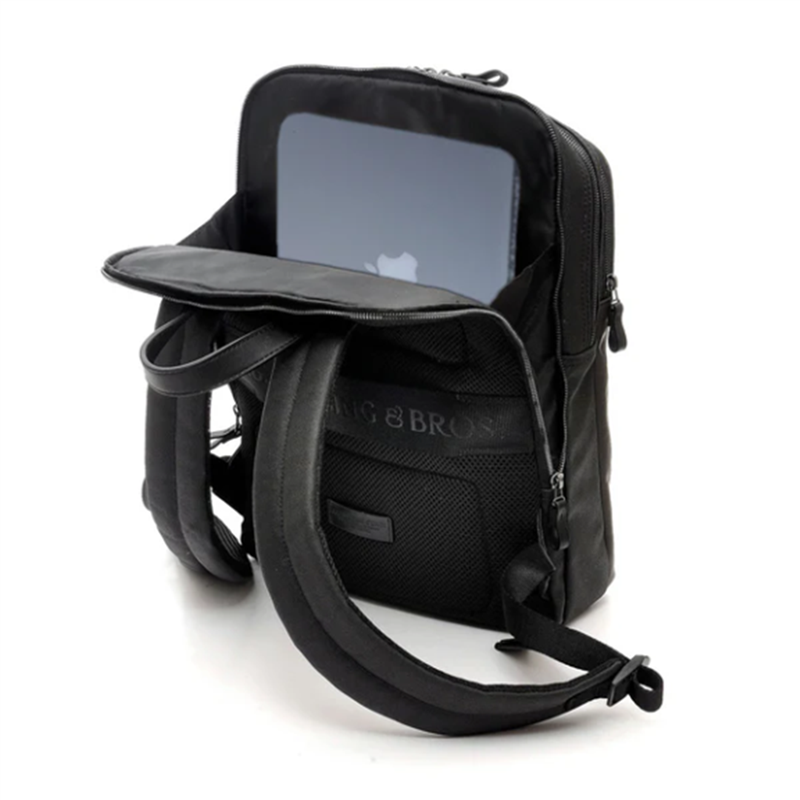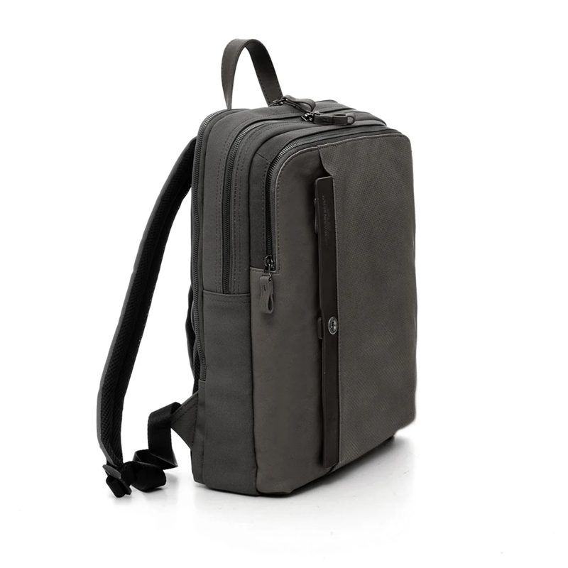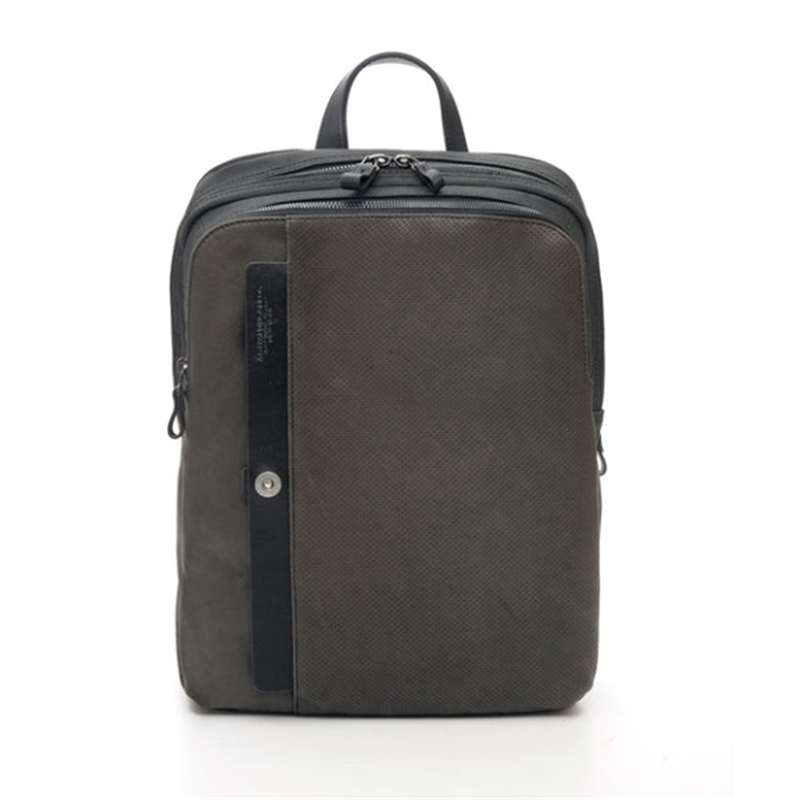 Material: nylon-ctone/perforated vegetable leather. External vertical pocket with personalized button and zip closure. Another large external pocket with zip closure. Large central compartment with double-sliding zip closure, with internal pocket for a laptop up to 14"- + zip pocket. On the back, a padded pocket with double-sliding zip closure holds a laptop up to 15/6"-. Padded back in breathable fabric with a trolley strap. Padded and ergonomic shoulder straps. Leather trim and zip pulls. Dimensions: 30x40x11 cm