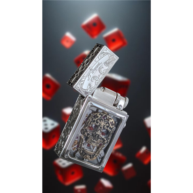 Made to order - Deposit required. Non-returnable. Inspired by the classic dice game 421, artisans meticulously crafted this luxury toy to ensure every component balances performance, aesthetics, and pleasure. Artisans carefully designed every detail to offer a unique experience, blending traditional gaming elements with technological innovation. The Lucky Skull Pocket Complication Lighter is a highlight for collectors and luxury enthusiasts. The artisan'-s expertise transforms an everyday object into a work of art, embodying both innovation and heritage. This lighter exemplifies how inspired design and expert craftsmanship can create extraordinary, conversation-making pieces, elevating a simple tool to a luxury object. The ultimate complication lighter, amplifying a mesmerizing mechanical skull movement. Careful diligence ensures that each lighter is unique, blending traditional gaming culture with modern luxury. The intricate designs and meticulous craftsmanship highlight the perfect fusion of past and present, making each piece a standout in any collection. The master craftsmen were inspired by the traditional 421 dice game and the unique design of a skull. They skillfully incorporated the skull'-s eye sockets and jaws into the lighter'-s mechanism, creating an immersive experience. By pressing a button on the side, users can roll the dice, showcasing the artisans'- creativity and skill. The Lucky Skull pocket complication lighter features an engraved flower pattern that enhances its aesthetic, with 26 exposed watchmaking jewels adding elegance and luxury. The sapphire crystal reveals a central skull that matches the lighter'-s finish, creating a cohesive and striking design. This masterpiece combines the micromechanics of fine watchmaking with the art of jewelry. Produced in a limited edition of 88 pieces for each colorway, this lighter is an epitome of exclusivity and luxury.