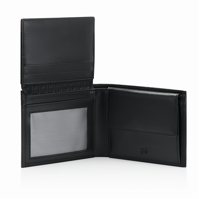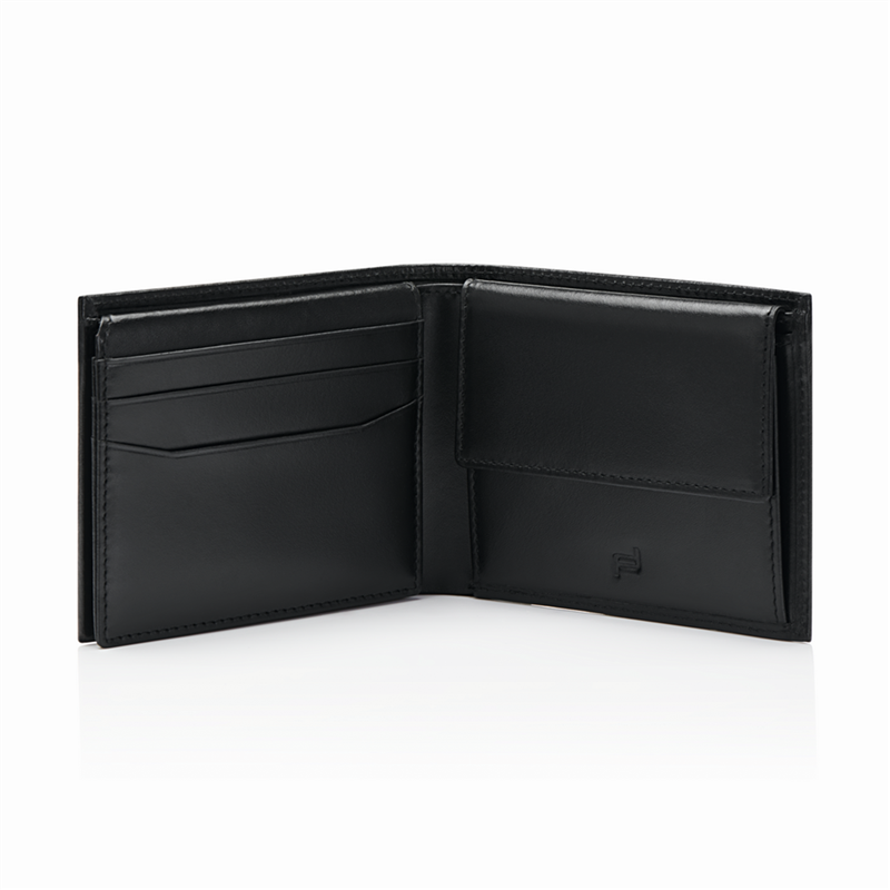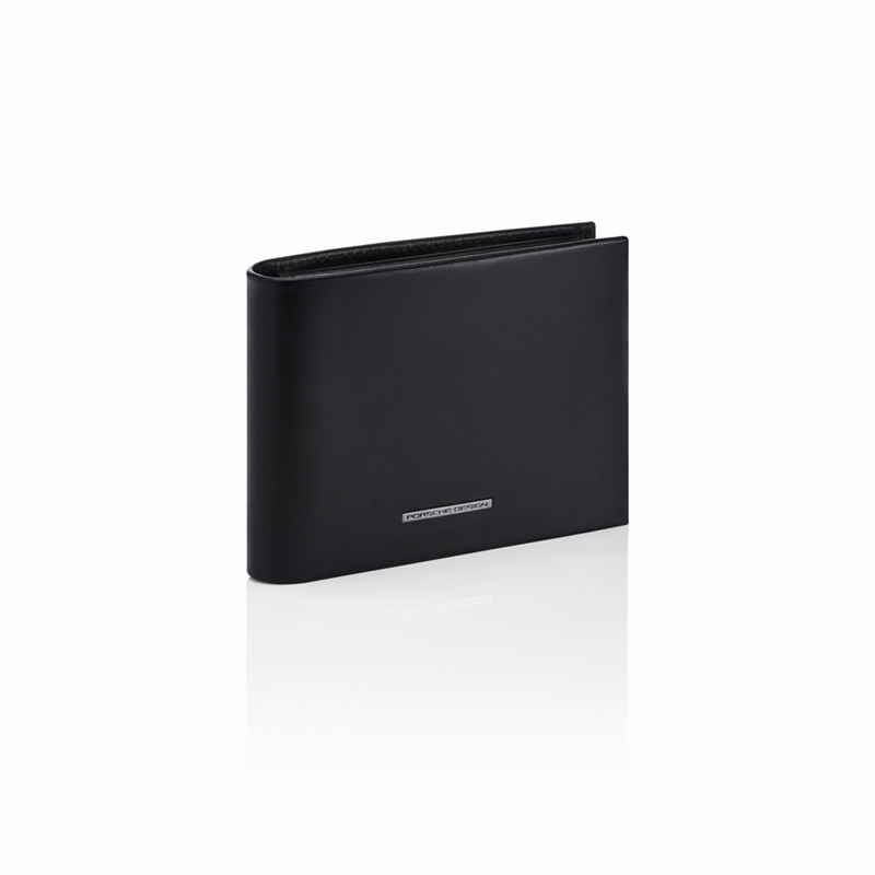 The elegant fusion of aesthetics and functionality: the Porsche Design Classic collection. The high-quality, smooth, shiny black leather, the perfectly finished exterior, and the distinctive Porsche Design logo plaque in metal give the Porsche Design Classic Wallet 5 a minimalist and timeless style. The high-quality interior finish, with unmistakable design details, perfectly matches the intelligent design: this compact men'-s wallet impresses with its spacious and functional interior. With five credit card slots, a coin compartment with snap closure, a compartment for banknotes, a mesh compartment for ID cards, and a larger compartment, e.g. for business cards, this vertically foldable wallet offers plenty of space for all your important cards and receipts. Details: • Compact, vertically foldable men'-s wallet with coin compartment • Smooth calfskin with metal plaque with Porsche Design logo • Five credit card slots • A mesh compartment for ID cards and a larger compartment for business cards • one compartment for banknotes • RFID protection"-