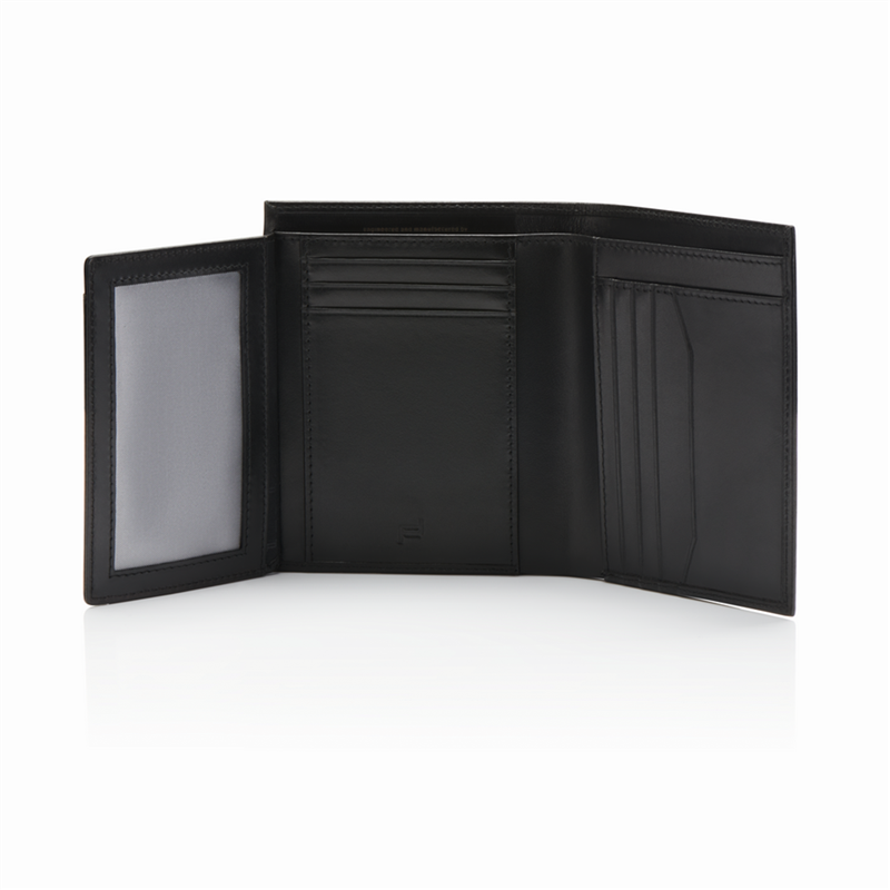 The elegant fusion of aesthetics and functionality: the Porsche Design Classic collection. The high-quality, smooth, shiny black leather, the perfectly finished exterior, and the distinctive Porsche Design logo plaque in metal give the Porsche Design Classic Billfold 11 wallet a minimalist and timeless style. The high-quality interior finish perfectly matches the intelligent design: this three-compartment men'-s wallet impresses with its generous and functional interior layout. With eleven credit card slots, a bill compartment, a mesh compartment for ID cards, and four larger pockets, such as for business cards, this wallet offers space for all your important cards and receipts. Details: • Vertical three-compartment men'-s wallet • Smooth calfskin with a Porsche Design logo plaque • Eleven credit card slots • One mesh compartment for ID cards and four larger pockets • One bill compartment • RFID protection
