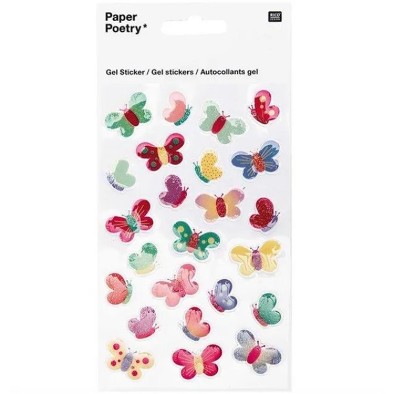 RICO DESIGN BUTTERFLIES GEL STICKERS ARE DECORATIVE BUTTERFLY STICKERS MADE OF A TRANSPARENT GEL MATERIAL. THESE STICKERS ARE IDEAL FOR DECORATING WINDOWS, MIRRORS AND OTHER SMOOTH SURFACES, ADDING A TOUCH OF COLOR AND VIVIDITY. EASY TO APPLY AND REMOVE, THEY OFFER A TEMPORARY AND REUSABLE SOLUTION TO DECORATE INTERIOR SPACES WITH A NATURAL AND DELICATE THEME.