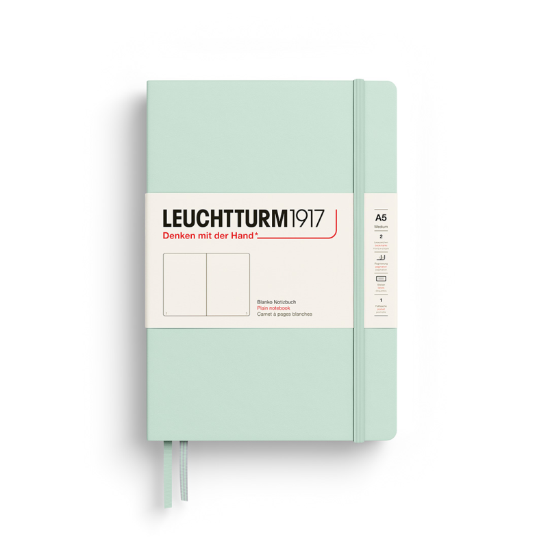 The medium A5 hardcover notebook from leuchtturm1917 in white offers 249 high-quality A5 pages, ideal for writing and taking notes. It features a durable hard cover that protects contents and ensures durability. The pages are numbered and include an index for easy organization. Additionally, the notebook features an elastic closure, two bookmarks, an internal expandable pocket, and removable perforated pages. The ivory-colored paper is compatible with various pens and inks, reducing the risk of smudging.
