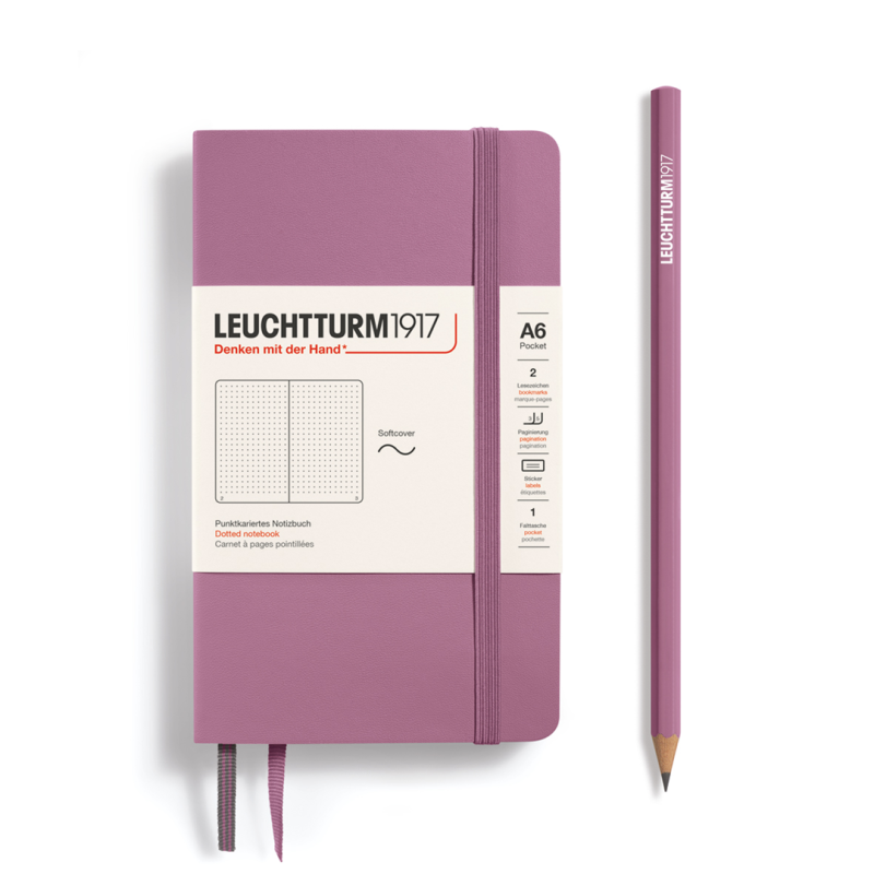 The A6 Pocket Soft Notebook with Dusty Rose Dots by Leuchtturm1917 is an elegant and compact notebook with a soft cover in a delicate dusty rose color. Featuring dotted pages, it'-s ideal for taking notes, drawing diagrams, or planning. The A6 size makes it perfect for carrying around, while the quality of the paper ensures a smooth writing experience. A matching elastic closure and bookmark complete the design for practical and efficient use.