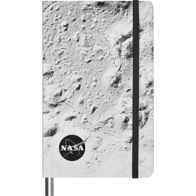 Discover a collection inspired by the spirit of exploration and the awe of human achievement in space. Imbued with the thrill of wonder, the NASA-inspired limited-edition collection reminds us that even giant leaps begin with the smallest ideas jotted down on a page. In your daily adventures on Earth, whether ordinary or extraordinary, using pen and paper is the best way to explore the boundless potential of the human imagination. The NASA-inspired limited-edition collection celebrates the heights of human potential, reminding us that our greatest resource has always been the boundless capacity of human genius. There are no limits to what we can accomplish. Make this notebook your space to explore the infinite wonders of your imagination, unleashing inspiration every time you put pen to paper. A tribute to the thinkers, designers, and explorers of all time. - Large, ruled notebook with a soft-touch cover inspired by the lunar surface. - Rounded corners, elastic closure, and a matching bookmark. - 100 g/m² ivory-colored, lined acid-free paper. - "-In case of loss"- label printed on the flyleaf. - Stickers to personalize your notes. - Expandable internal pocket on the back. - 180° opening. - The entire Moleskine history inside. - The paper in this Moleskine product is made with materials from well-managed, FSC®-certified forests and other controlled sources.