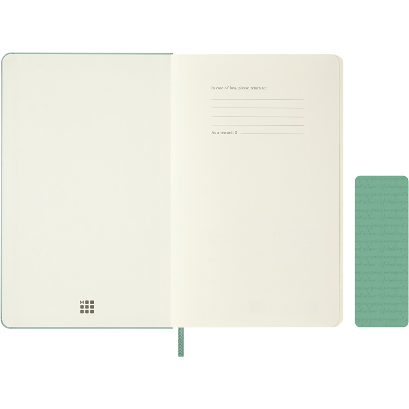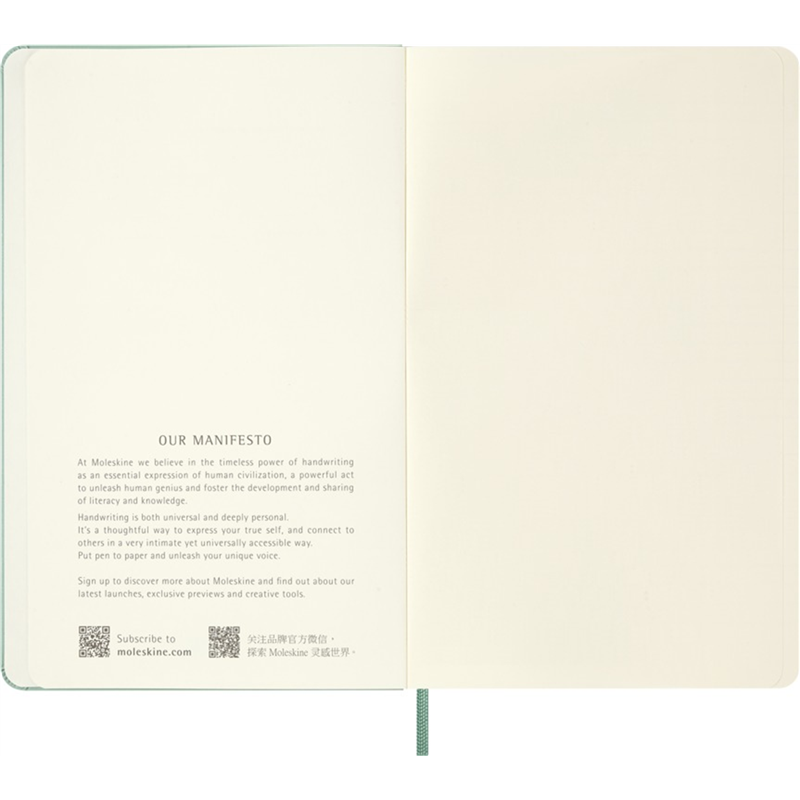 Moleskine'-s Sage Green Large Plain Neutral Notebook is an elegant and minimalist notebook featuring a refined sage green hard cover. Featuring blank, unlined pages, it'-s ideal for writing, drawing, or taking notes with complete freedom. Its large size offers ample space for creative expression, while the classic Moleskine design ensures a high-quality product, perfect for everyday use.