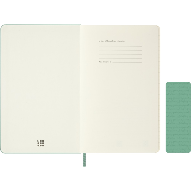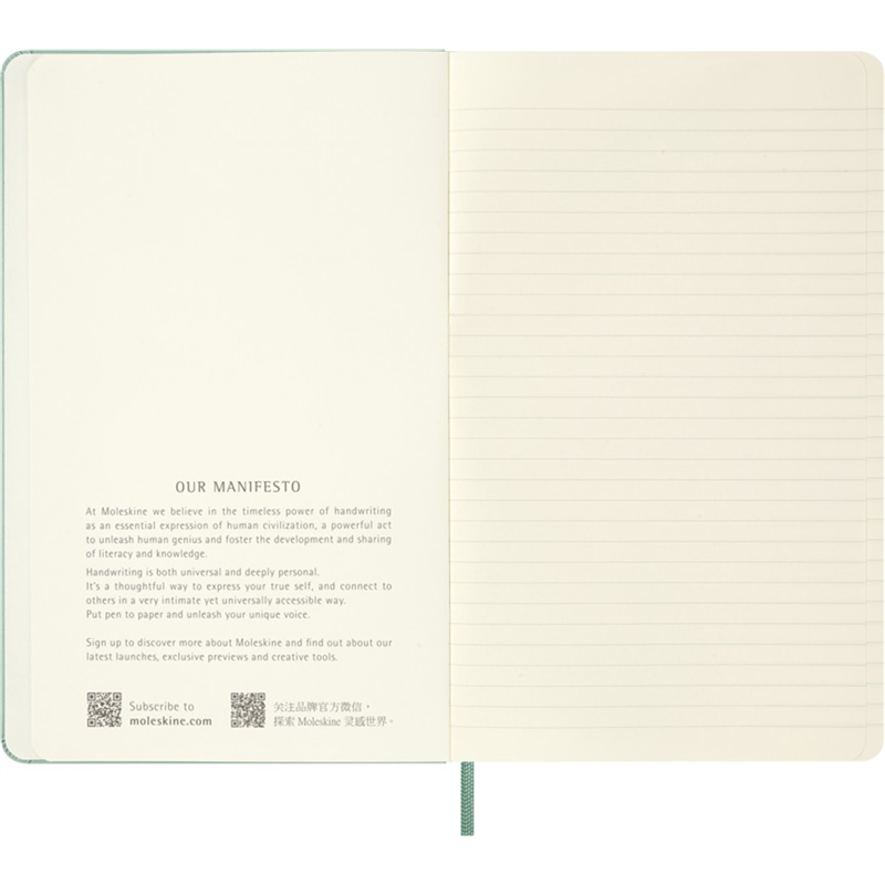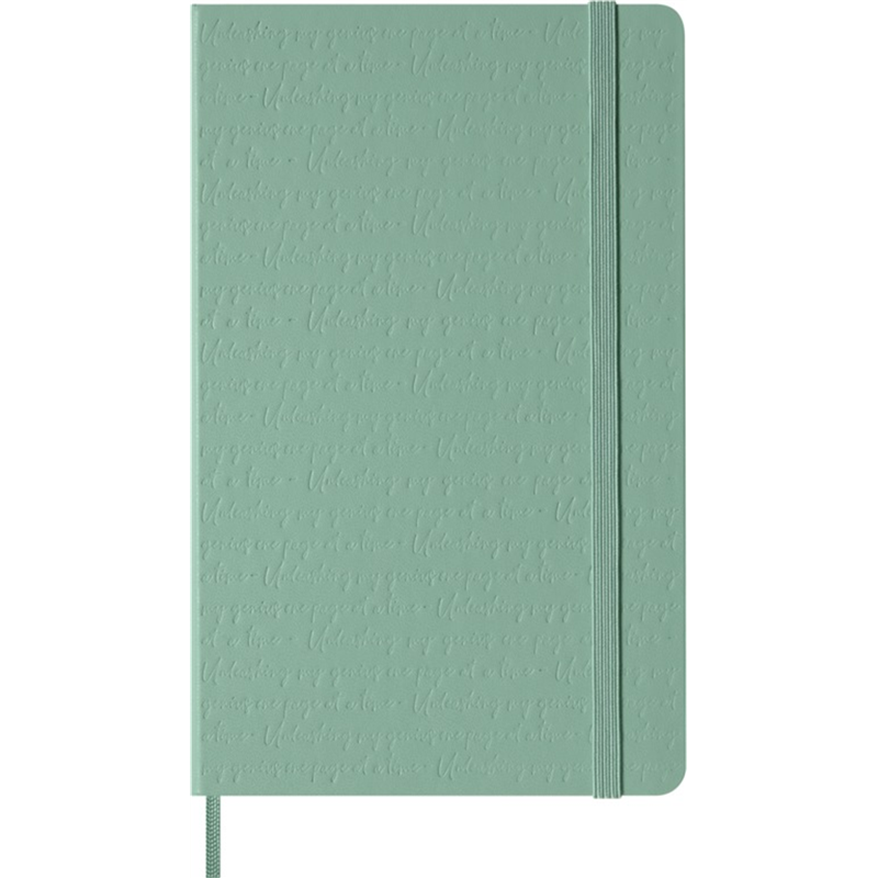 Moleskine Large Ruled Notebook in Sage Green: An elegant sage green hard cover notebook, ideal for daily notes and reflections. Featuring 240 lined pages on high-quality paper, an elastic closure, and a handy bookmark, it'-s perfect for anyone looking for a refined and functional writing tool.