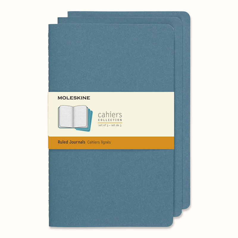 the cahier notebooks have a heavy cardboard cover with visible stitching on the coast. the last 16 sheets are detachable and, inside, a large pocket ideal for sheets and slips, contains a text that tells the story of moleskine. chlorine-free paper and lined pages.
