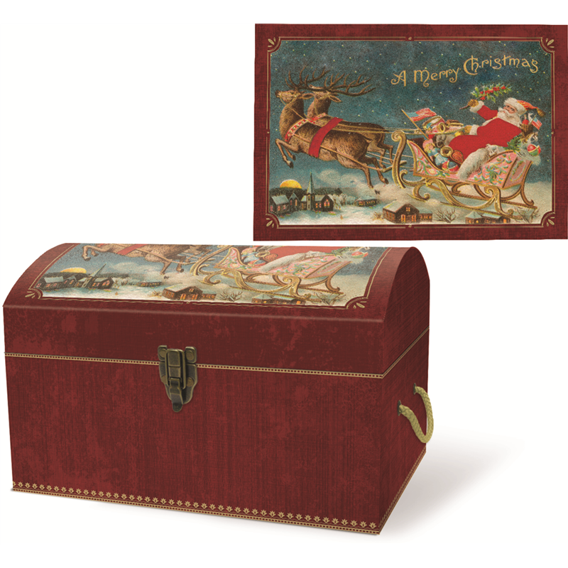 THE SANTA'-S SLEIGH CHRISTMAS TRUNK BOX, DIMENSIONS 41X31X27 CM, FROM THE VERTECCHI SELECTION, IS AN ELEGANT CHRISTMAS CONTAINER, PERFECT FOR STORING GIFTS AND DECORATIONS. THE DESIGN RECALLS THE FESTIVE ATMOSPHERE, DEPICTING SANTA'-S SLEIGH, AND ADDS A TOUCH OF MAGIC TO CELEBRATIONS. MADE WITH QUALITY MATERIALS, IT IS RESISTANT AND REUSABLE, IDEAL FOR THOSE WHO WANT A PRACTICAL AND DECORATIVE SOLUTION FOR ORGANIZATION DURING THE FESTIVALS.