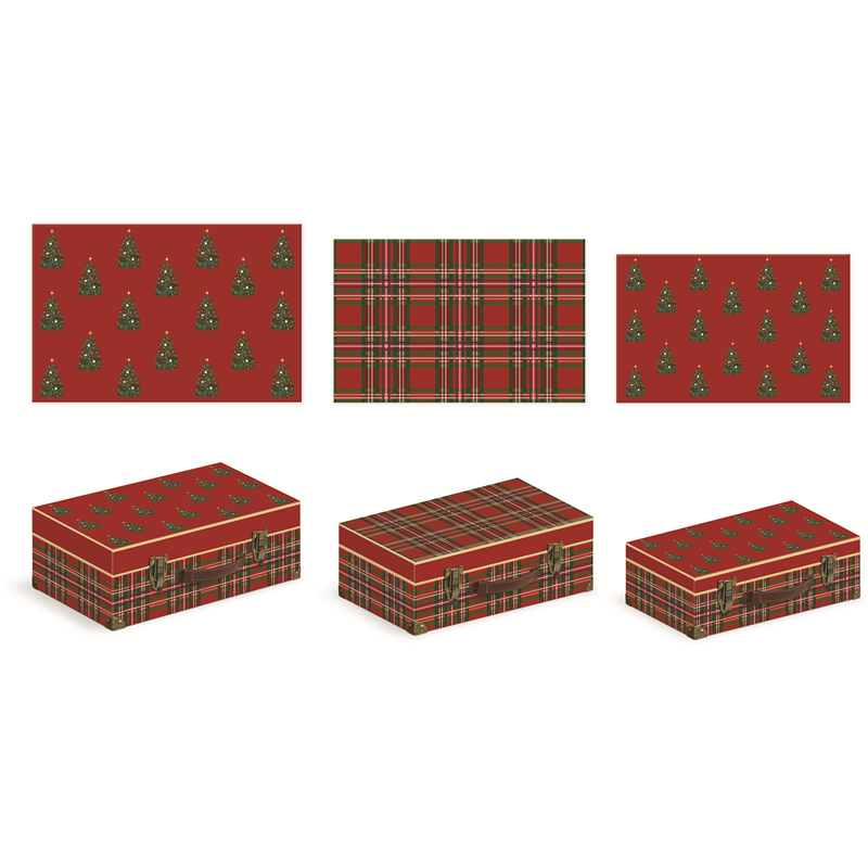 THE 45X31X15CM SCOTTISH CHRISTMAS SUITCASE BOX WITH FIR TREES FROM THE VERTECCHI SELECTION IS AN ELEGANT GIFT BOX WITH A CHRISTMAS DESIGN. MADE WITH A SCOTTISH PATTERN AND DECORATED WITH FIR TREES, THIS STURDY AND SPACIOUS BOX IS IDEAL FOR CONTAINING AND PRESENTING GIFTS OF VARIOUS SIZES, ADDING A FESTIVE AND REFINED TOUCH TO YOUR CHRISTMAS SURPRISES. PERFECT FOR THOSE LOOKING FOR A CURE AND DISTINCTIVE PRESENTATION.