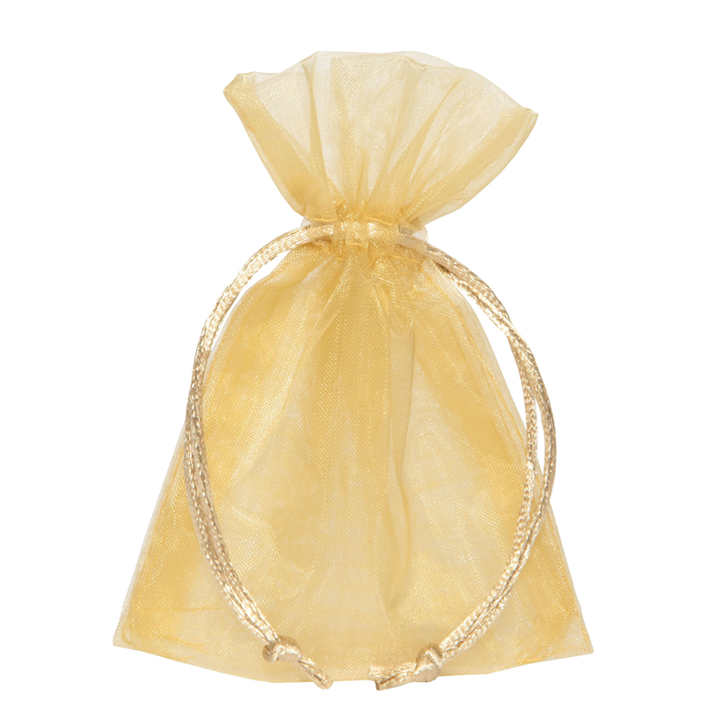 Gold-colored organza pouch, size 9x12 cm, pack of 10 pieces, ideal for wrapping small gifts or favors. Part of the Vertecchi Selection.