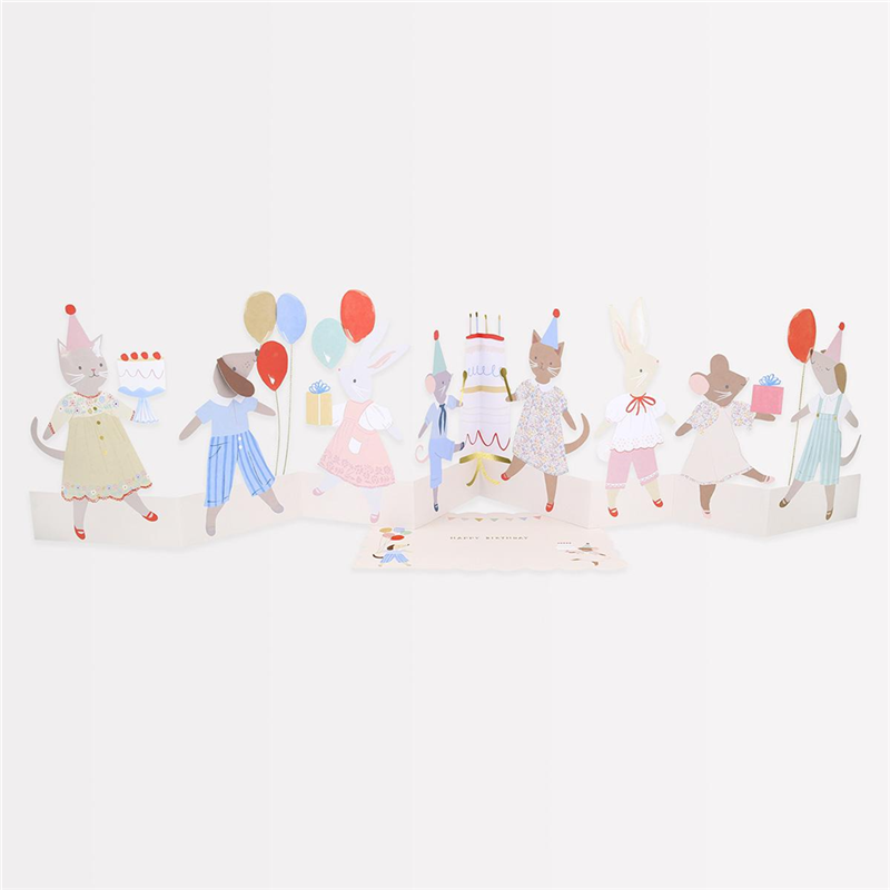 Greeting card decorated with a garland of colorful and festive animals, perfect for celebrating special moments with a touch of cheerfulness and originality.