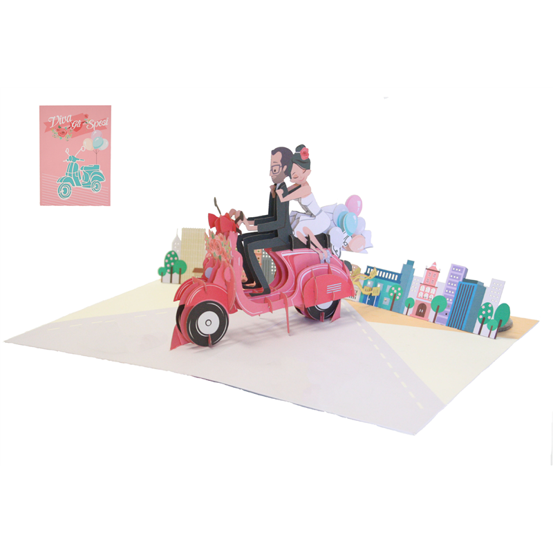 Handmade kirigami greeting card depicting a couple of newlyweds on a Vespa. Crafted with artisanal precision, the detailed and three-dimensional design celebrates love and adventure, perfect for weddings or anniversaries. Origamo quality ensures an elegant and unique touch.