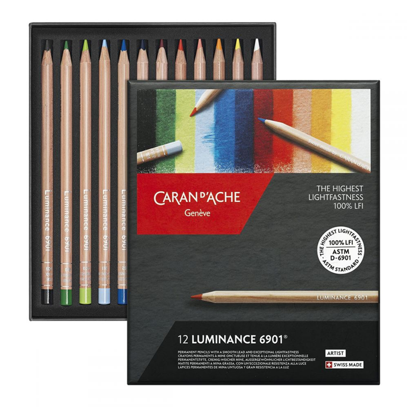The Caran d'-Ache Luminance 6901 Pencil Set of 12 includes wax-based colored pencils designed for professional artists. The pencils offer intense pigmentation and a creamy consistency, ensuring optimal coverage and superior mixability. Each pencil is crafted from high-quality cedar wood for easy sharpening and features exceptional lightfastness, rated according to ASTM D6901 standards. The colors included in the set are carefully selected to offer a balanced range of vibrant, natural hues.