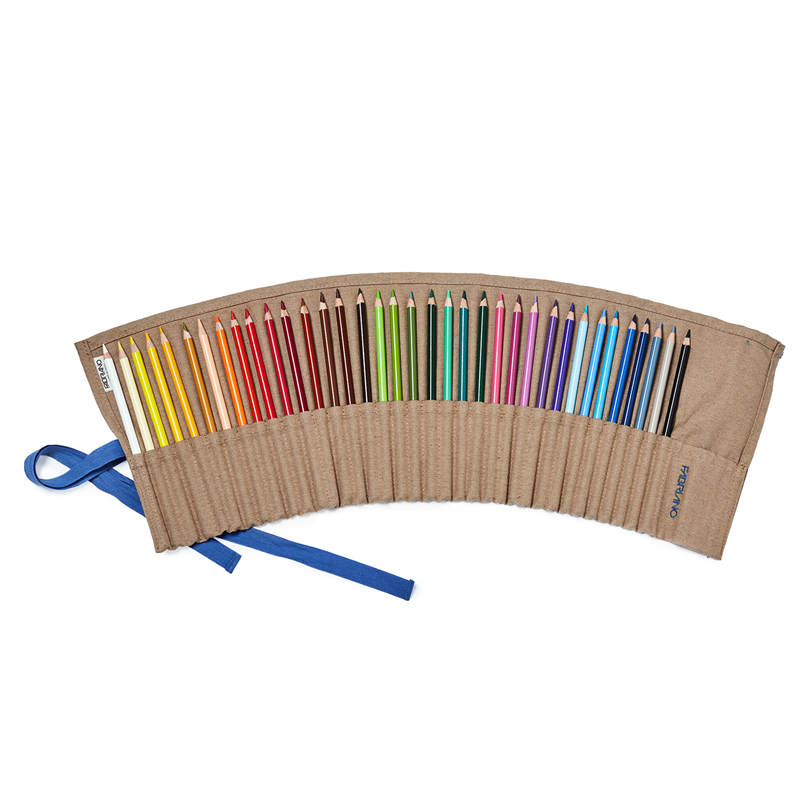THE CASE IS MADE OF NATURAL BROWN FABRIC, DESIGNED TO HOLD UP TO 36 CRAYONS. THE CASE HAS INDIVIDUAL COMPARTMENTS FOR EACH CRAYON, ENSURING PROTECTION AND ORGANIZATION. THE CASE IS CLOSURED WITH A TIE THAT SECURES THE CONTENTS DURING TRANSPORT. THE COMPACT AND ROLLED-UP DESIGN ALLOWS FOR EASY PORTABILITY. THE QUALITY OF THE FABRIC AND THE ATTENTION TO DETAIL GIVE IT AN ELEGANT AND FUNCTIONAL APPEARANCE.