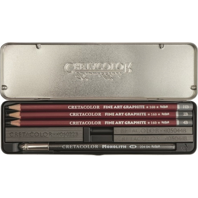 This pocket-sized set contains 3 Cleos graphite pencils (HB, 2B, and 4B), 2 graphite sticks (4B and 6B), a jumbo graphite stick (2B), and a capped woodless graphite pencil (4B).