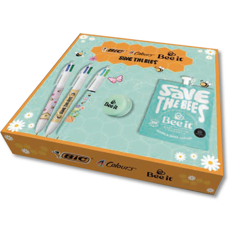 Contains 3 Bic 4colours dedicated to bees, 1 travel container for 15ml cream, 1 Bee It hand and body cream 50ml