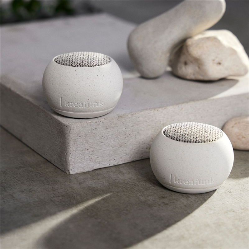 The English translation is: The L'Ago Stone Speaker Waterproof Eco Natural by Kreafunk is an eco-friendly portable speaker made with sustainable materials. It features a sleek and compact design, water resistance, and ensures high-quality sound. Perfect for outdoor use, it combines functionality and environmental respect.